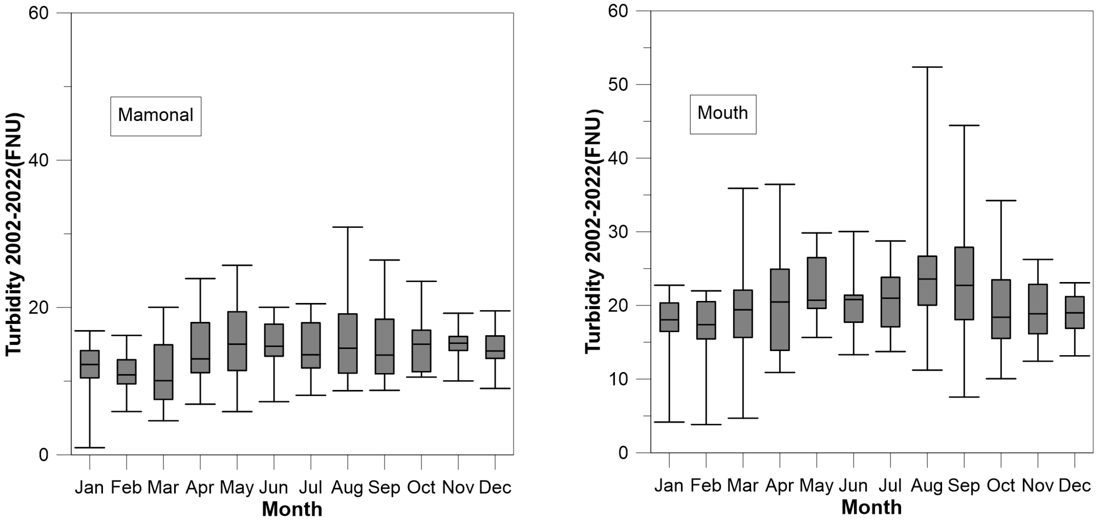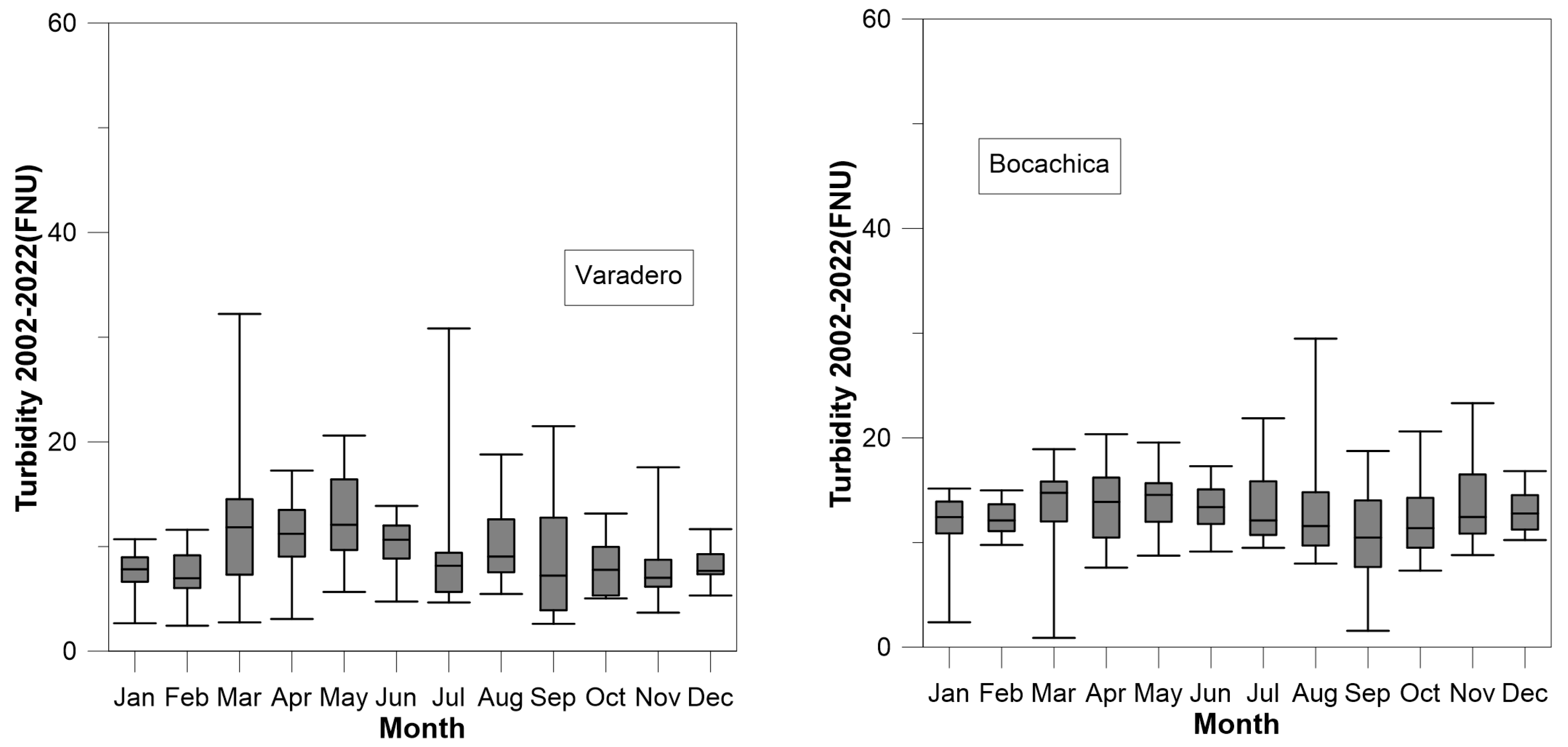 | This study | Niña: High Precipitation Niño: Low Precipitation | 2002–2022 | Derived from a remote sensing algorithm applied to MODIS data | Although ENSO moderately influences freshwater discharge, no direct relationship with turbidity levels in Cartagena Bay was identified (especially during La Niña events). While the sediment input from the Canal del Dique plays a key role in turbidity, its spatial distribution within the bay is largely influenced by local hydrodynamic processes such as tides and currents. |