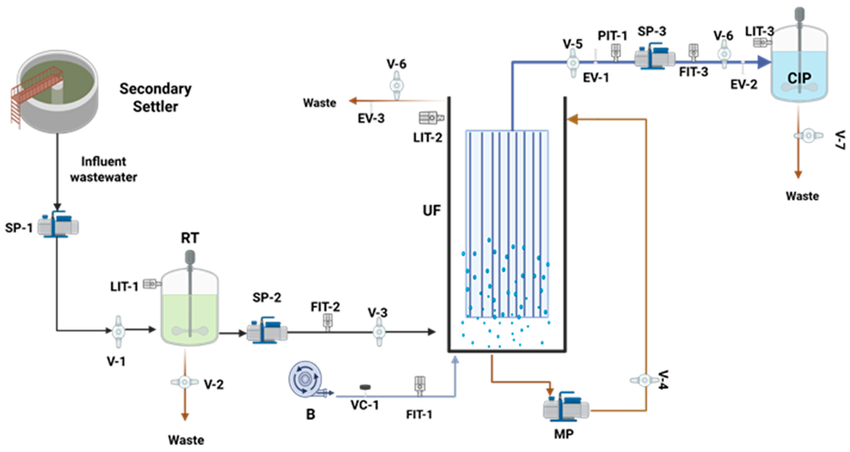 - Sanchis-Perucho, P.; Aguado, D.; Ferrer, J.; Seco, A.; Robles, A. Evaluating resource recovery potential and process feasibility of direct membrane ultrafiltration of municipal wastewater at demonstration scale. Environ. Technol. Innov. 2023, 32, 103252. [Google Scholar] [CrossRef]