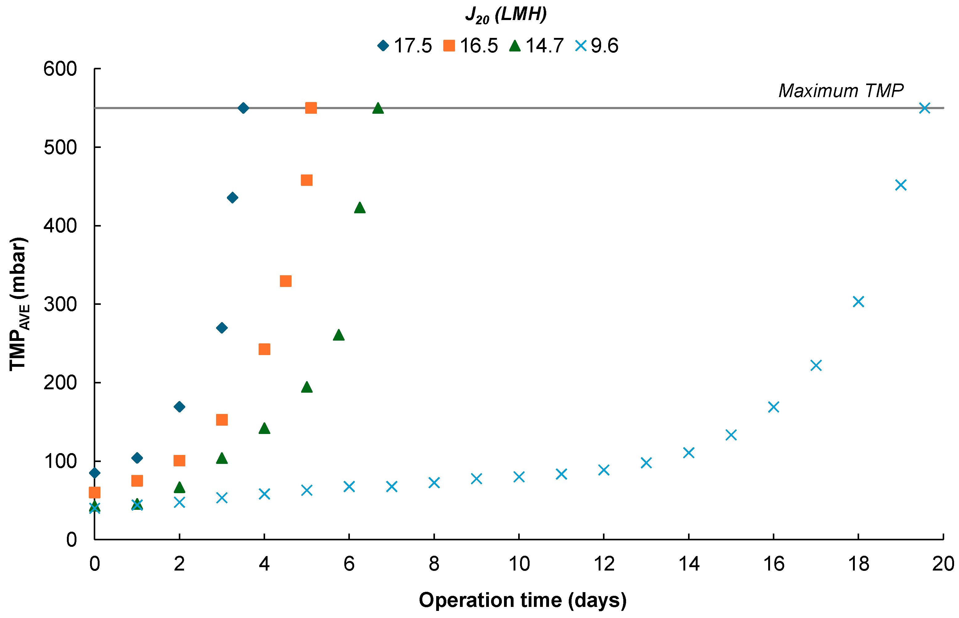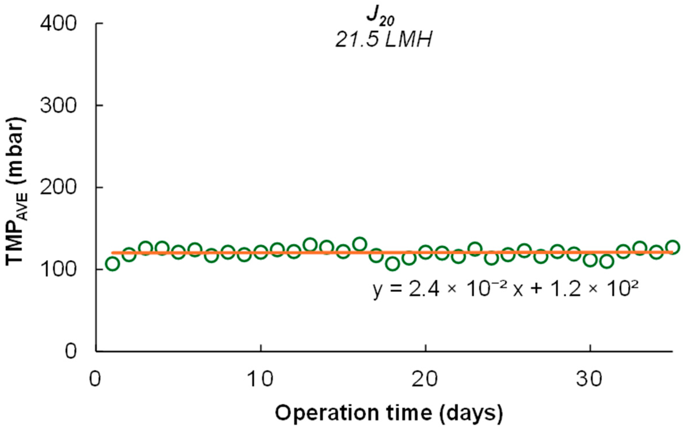 - Filtration was possible for more than 35 days at a J20 value of 21.5 LMH, with a reduced fouling growth rate of about 0.024 mbar day−1, thanks to all the fouling control strategies evaluated in this work. Thus, continuous filtration could be possible for more than 1 year without requiring the process to be halted to conduct conventional chemical cleanings.
