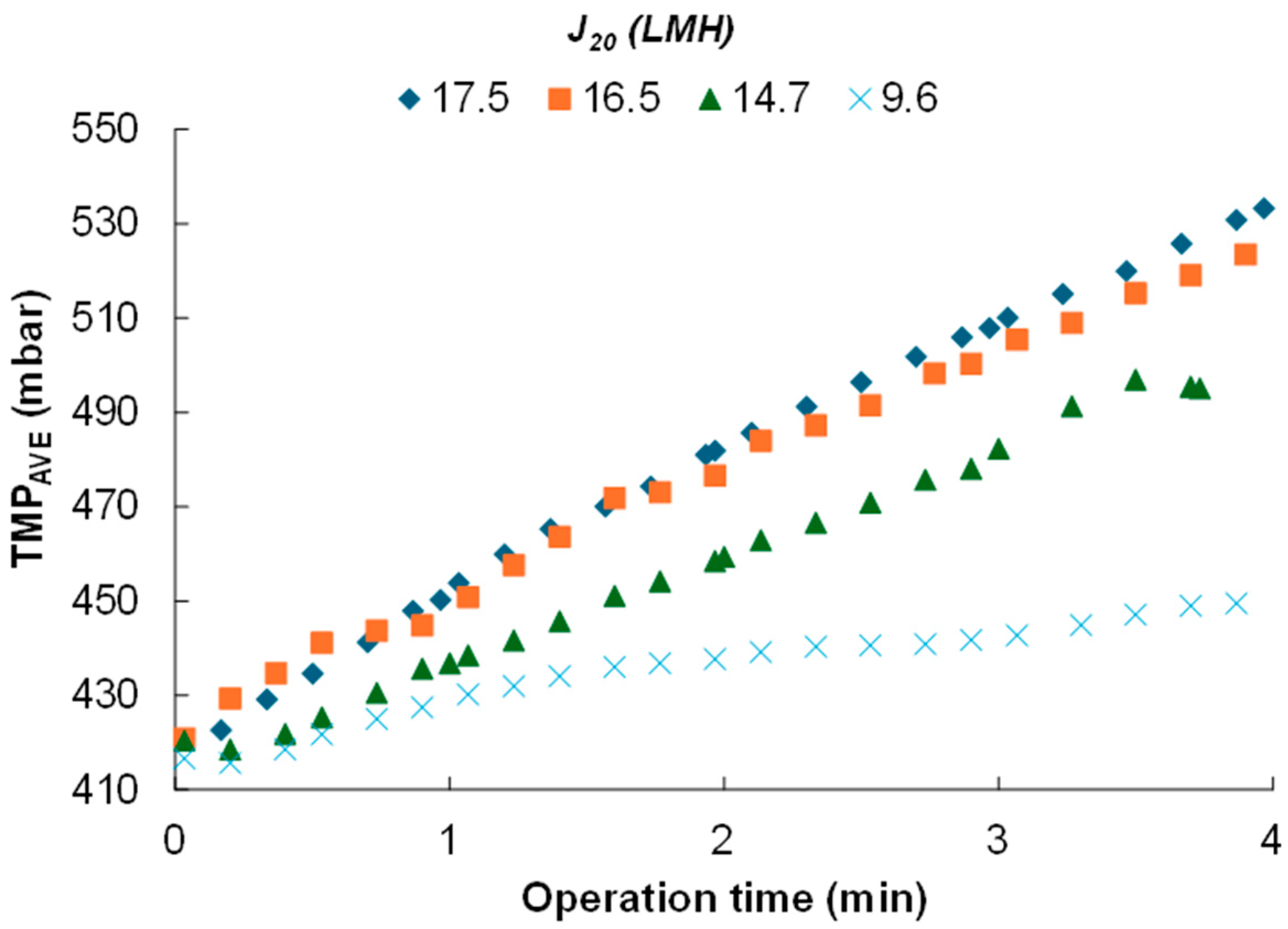 3.1. Effects of Transmembrane Flux on Membrane Fouling