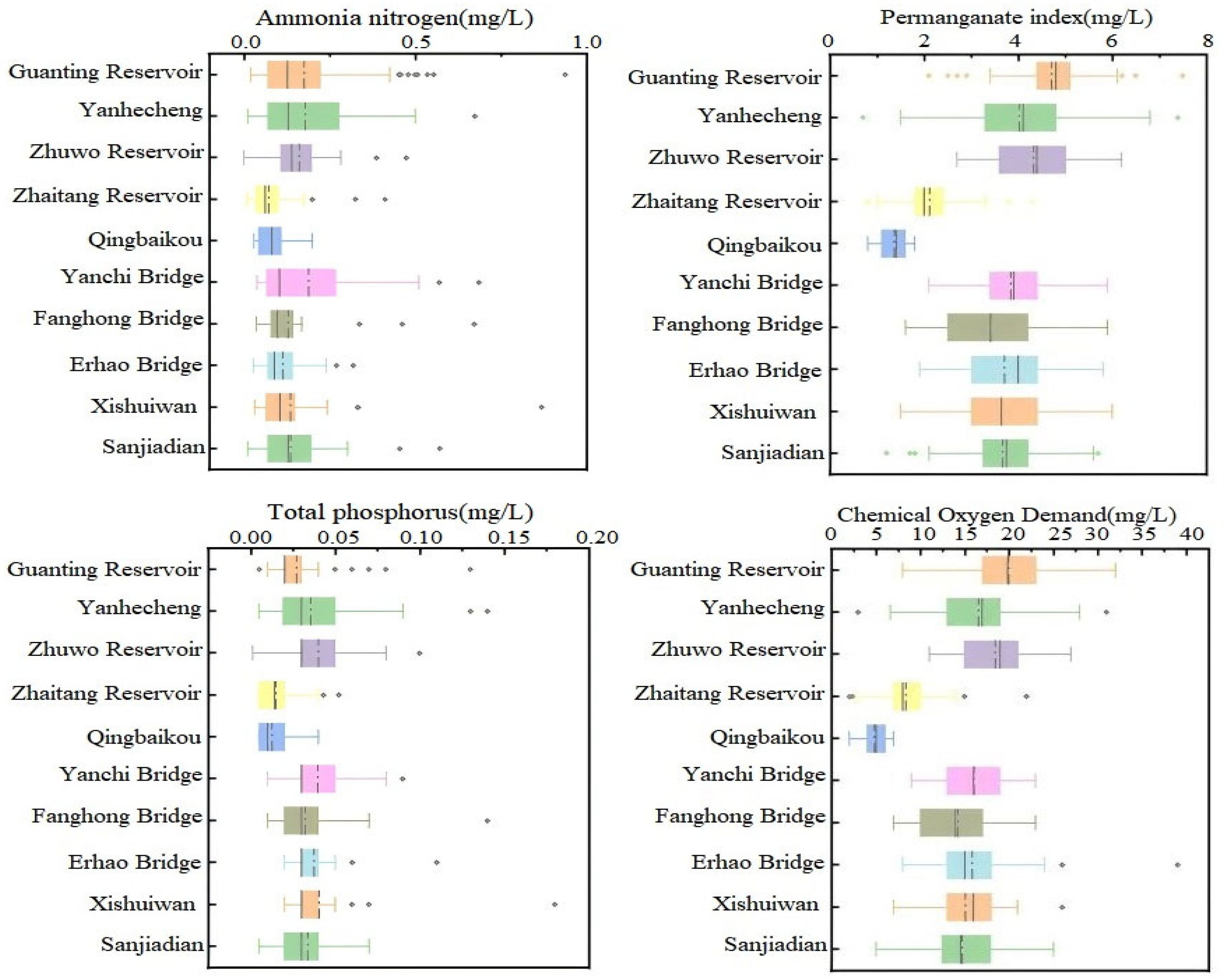 - Unlike other indicators, total phosphorus exhibits a distinct spatial pattern, showing a marked increase from Guanting Reservoir to Yanhecheng. Analyzing its distribution over different periods reveals higher concentrations during non-supplementation and non-flood seasons compared to other periods. This indicates relatively elevated baseline total phosphorus levels in the river channel, leading to higher concentrations during these periods.