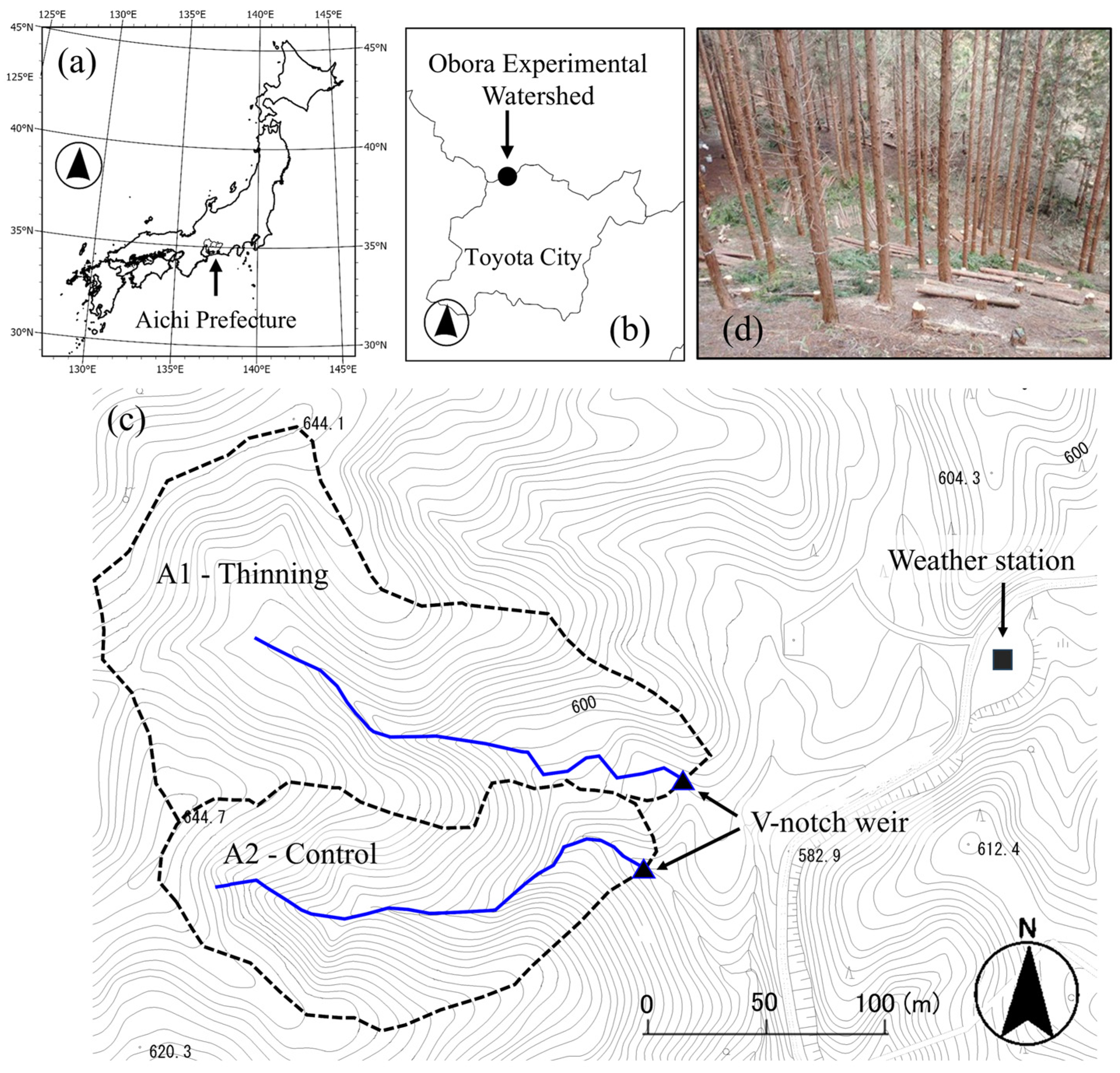 - Dung, B.X.; Gomi, T.; Miyata, S.; Sidle, R.C.; Kosugi, K.; Onda, Y. Runoff responses to forest thinning at plot and catchment scales in a headwater catchment draining Japanese cypress forest. J. Hydrol. 2012, 444–445, 51–62. [Google Scholar] [CrossRef]