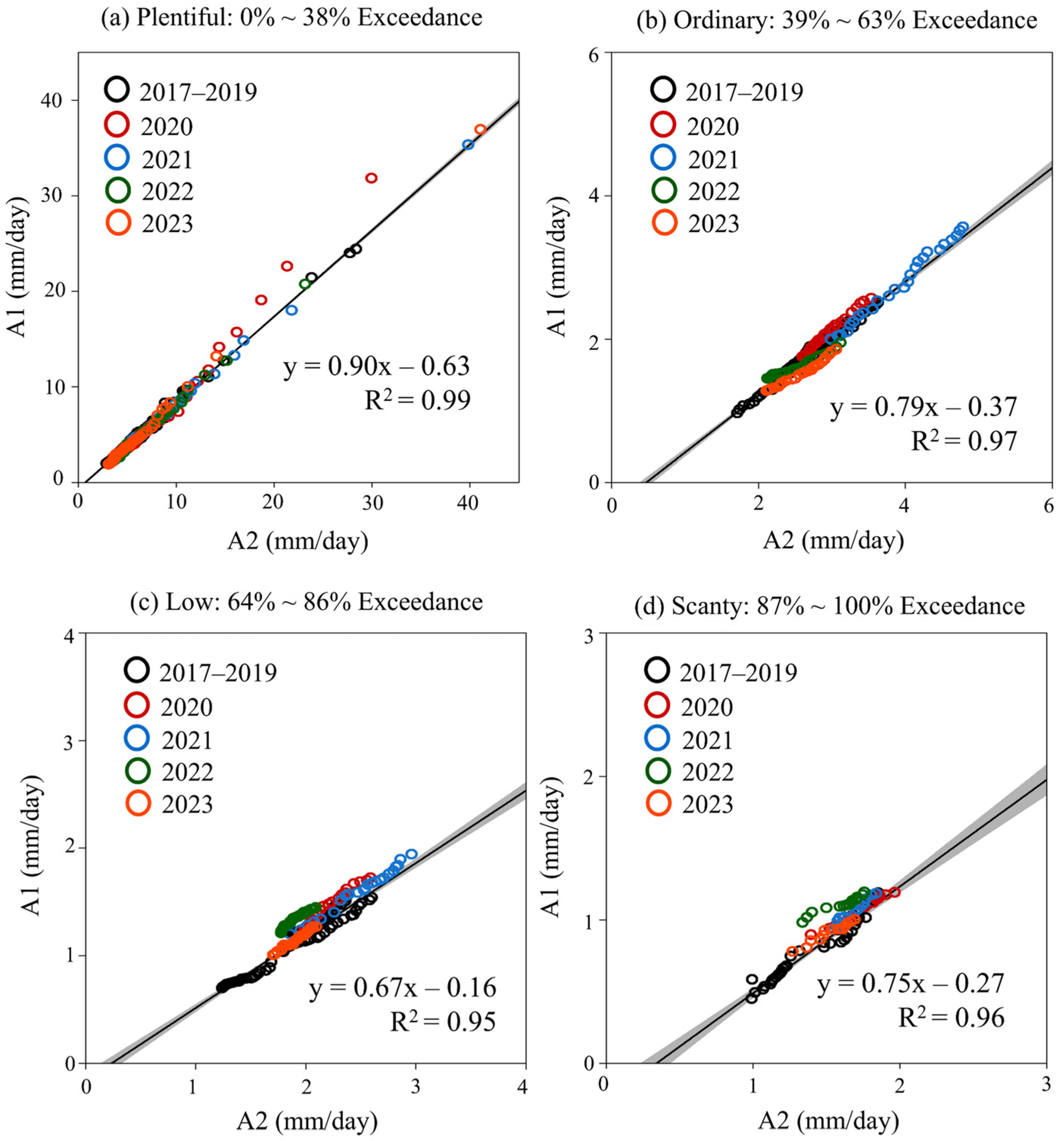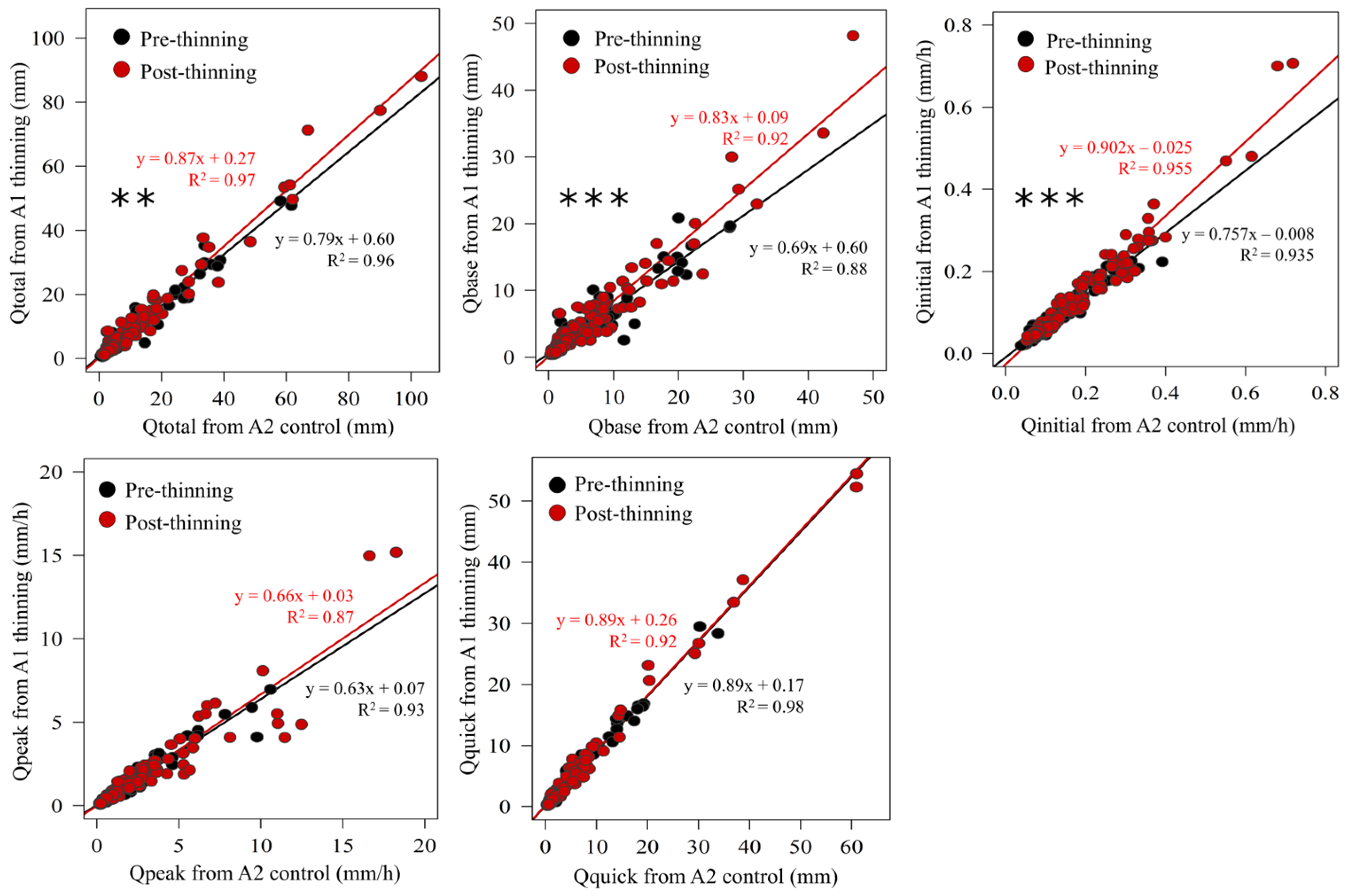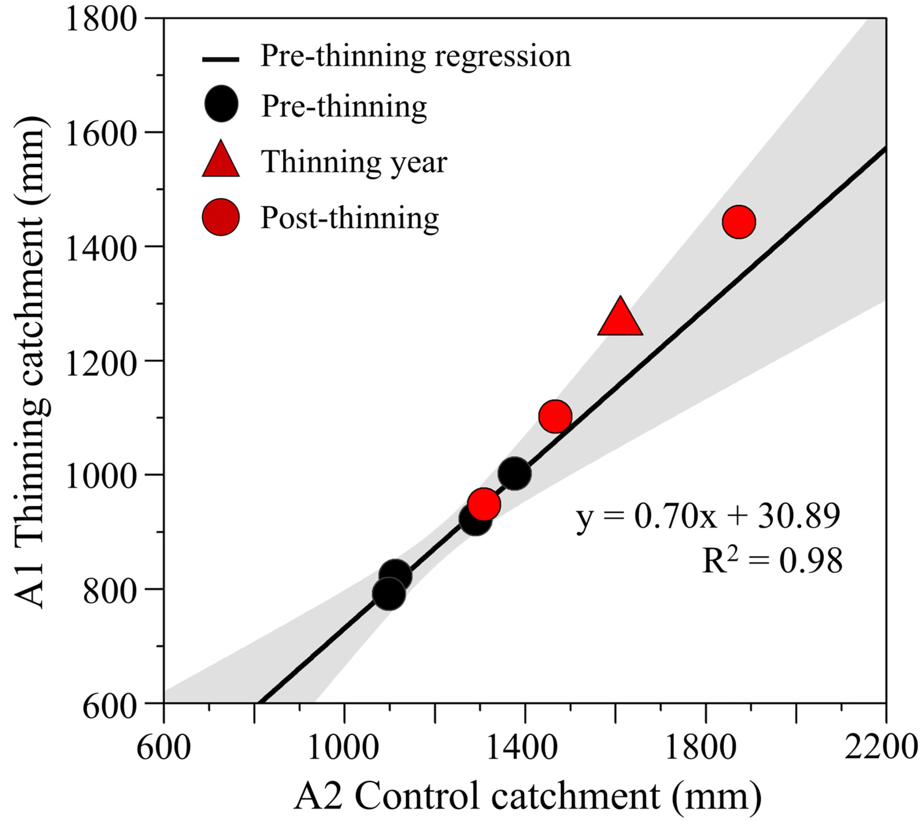 | Year | Precipitation (mm) | A2 Control Catchment | A1 Thinning Catchment | ||||