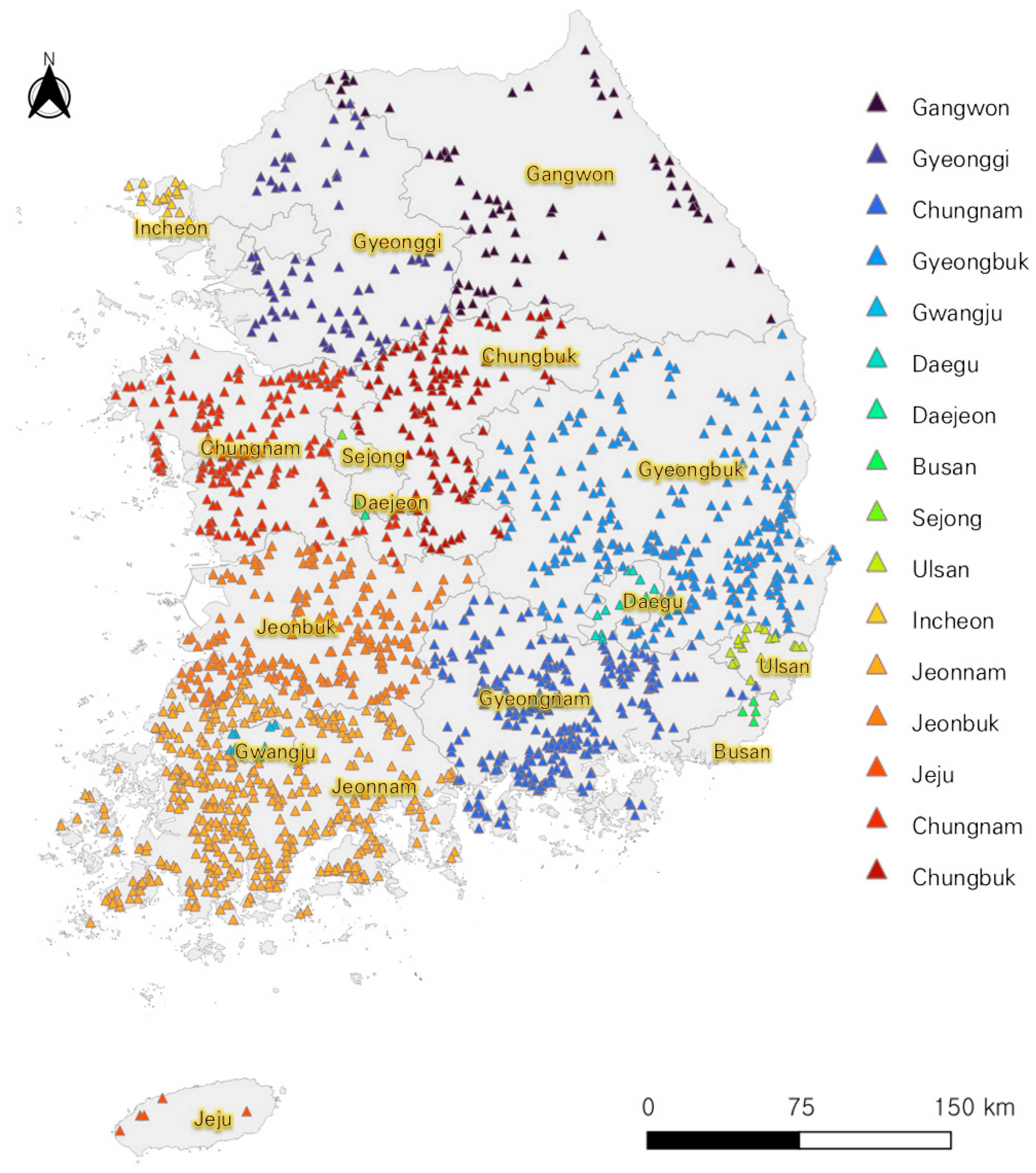 This study examined the application of design standards for agricultural production infrastructure (reservoirs) that incorporate the impacts of climate change. The analysis focused on 1687 reservoirs assessed by the Korea Rural Community Corporation for climate change impact and vulnerability based on Shared Socioeconomic Pathways (SSP) scenarios. The distribution of the target reservoirs is highest in Jeollanam-do, with 419 locations, followed by Gyeongsangbuk-do with 286. In contrast, Gwangju, Daegu, Daejeon, Busan, Sejong, Ulsan, Incheon, and Jeju have relatively fewer reservoirs compared to other regions (Table 1, Figure 2).