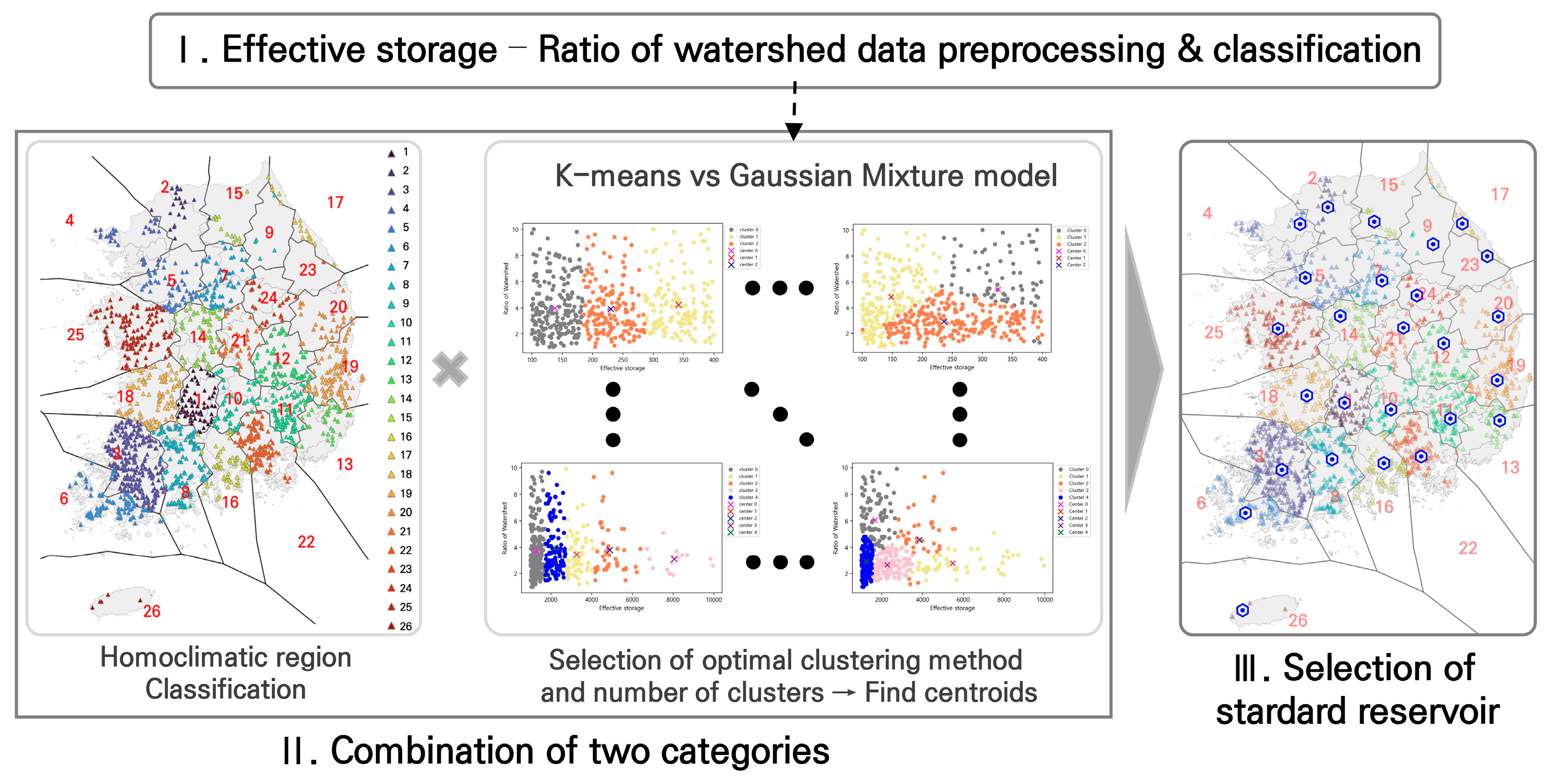 In this study, we classified 1678 reservoirs selected by the Korea Rural Community Corporation for climate change impact and vulnerability assessment into meteorologically homogeneous regions using the regional frequency analysis methodology outlined in the Ministry of Environment’s flood estimation guidelines. As part of this process, Thiessen polygons were generated. To analyze the data, we applied both K-means and Gaussian Mixture Model (GMM) clustering, using effective reservoir capacity and watershed area ratio as key variables. The optimal clustering method and the appropriate number of clusters were determined based on multiple evaluation metrics, including the Silhouette Score, Calinski-Harabasz Index, Akaike Information Criterion (AIC), and Bayesian Information Criterion (BIC). Finally, we identified standard reservoirs applicable to the design standards for agricultural production infrastructure by integrating the results of the meteorologically homogeneous regional clusters, the optimal clustering method, and the centroid locations corresponding to the selected number of clusters (Figure 1).