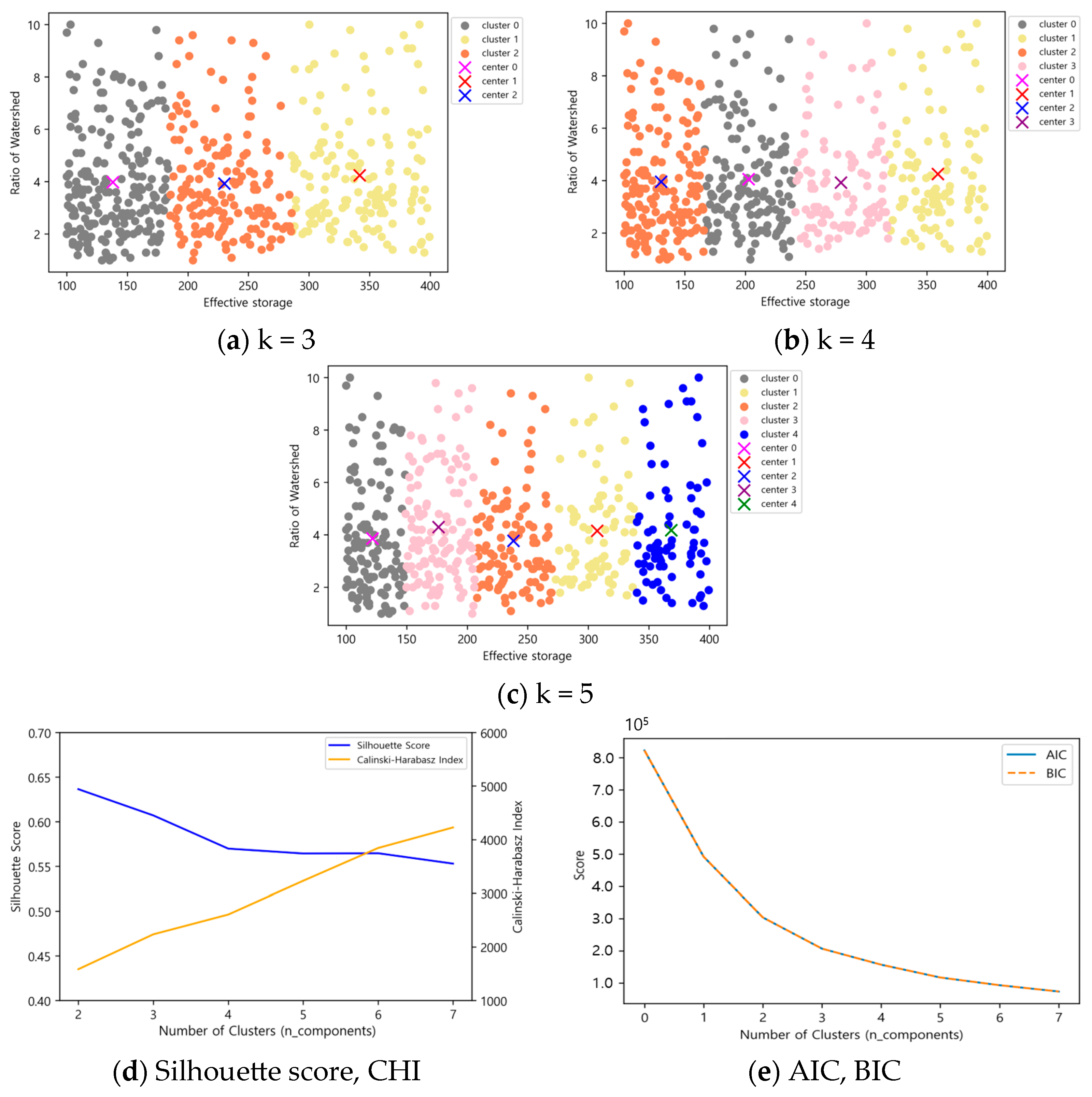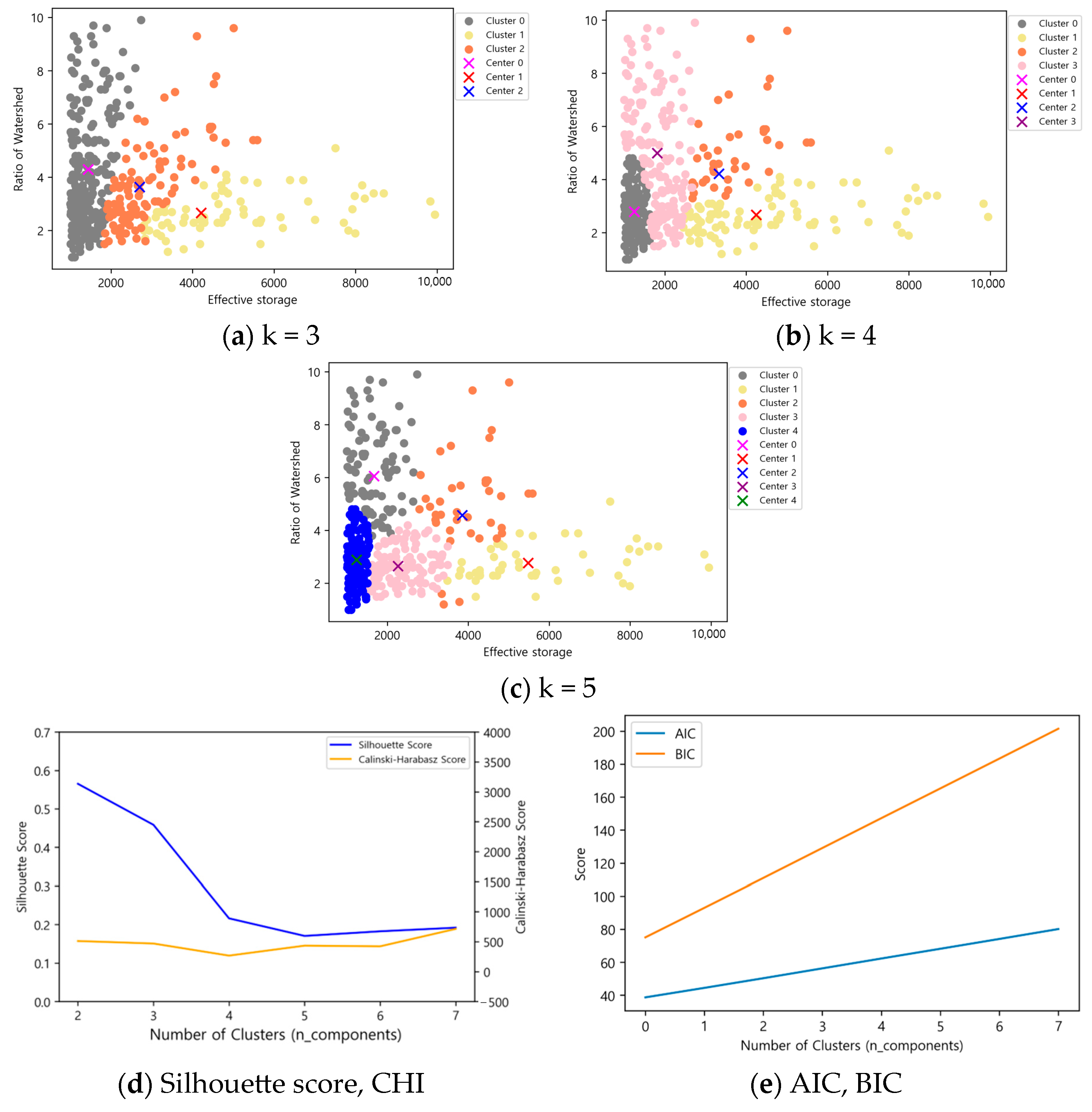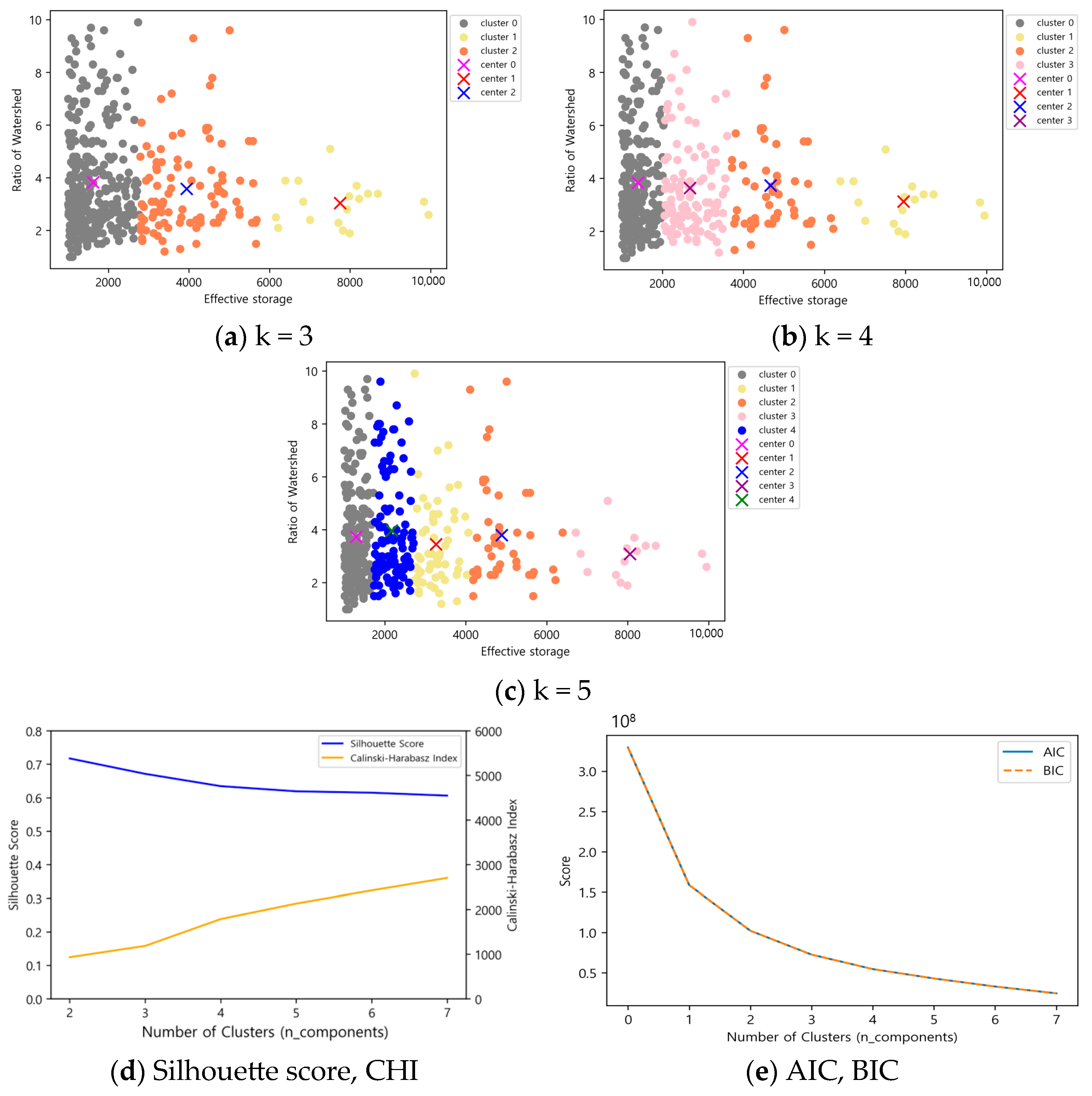 In contrast, the Gaussian Mixture Model clustering successfully separated clusters according to the relative sizes of effective reservoir capacity and basin ratio in all cases. The Silhouette score and CHI exhibited consistent trends based on the number of clusters, while AIC and BIC showed significant differences of two or more, making this method suitable for clustering selection.
