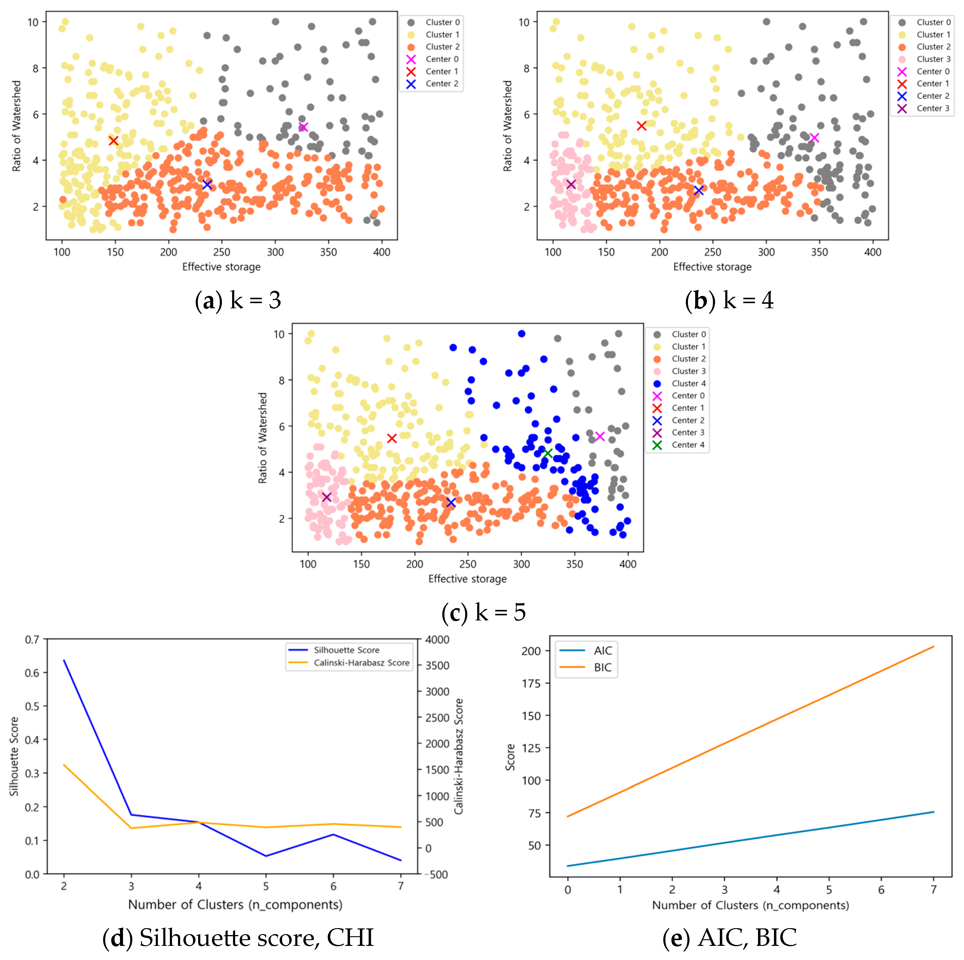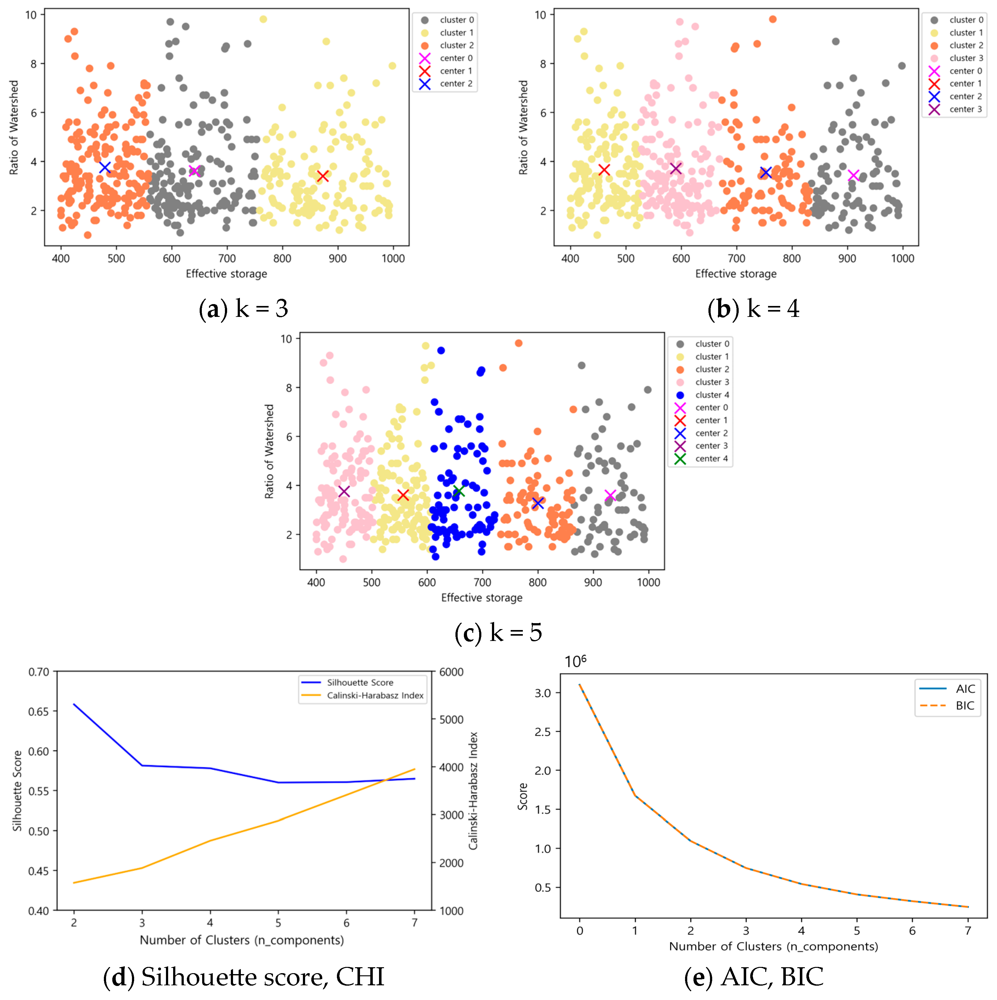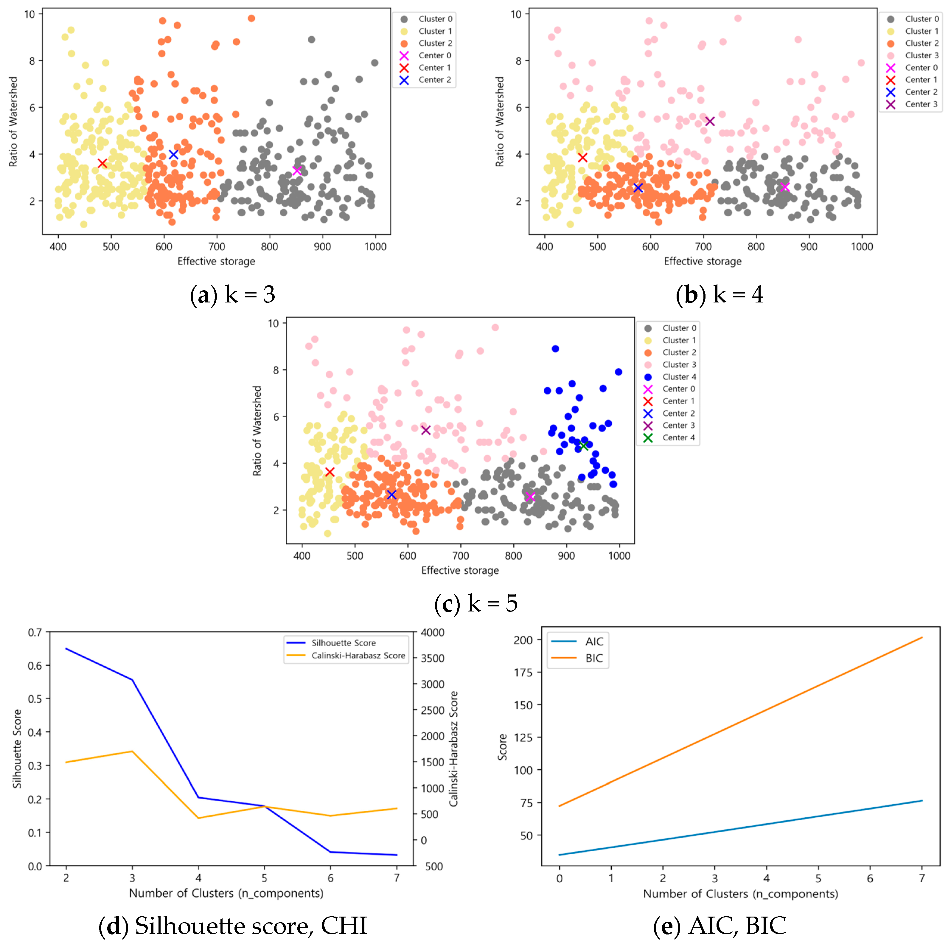 In contrast, the Gaussian Mixture Model clustering successfully separated clusters according to the relative sizes of effective reservoir capacity and basin ratio in all cases. The Silhouette score and CHI exhibited consistent trends based on the number of clusters, while AIC and BIC showed significant differences of two or more, making this method suitable for clustering selection.
