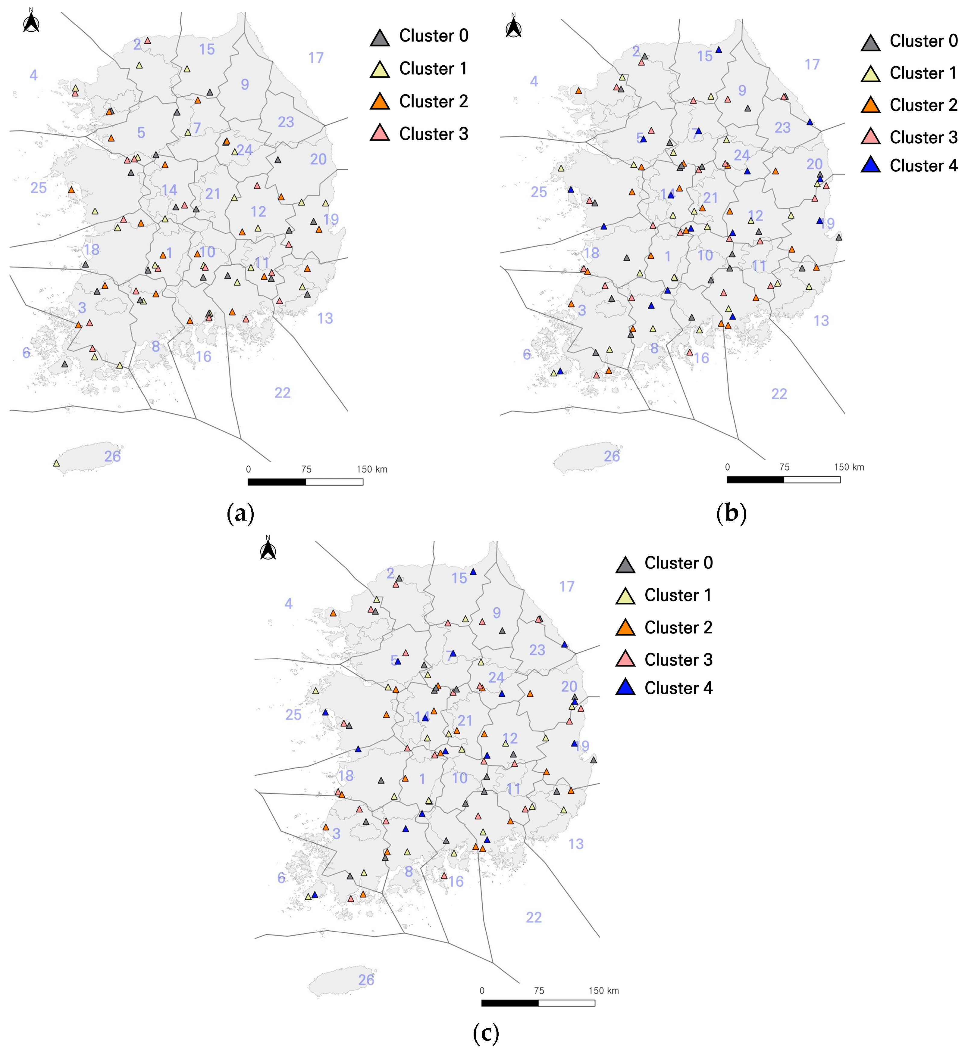 In this study, we addressed the limitations of conventional point frequency analysis, such as short data recording periods and the lack of consideration for regional characteristics, by utilizing regional frequency analysis data from the Standard Guidelines for Flood Estimation [20]. Due to the nature of agricultural production infrastructure (reservoirs), these facilities are not typically located near weather observation stations. As shown in Figure 2, the large number of reservoir sites makes it challenging for the 103 ASOS (Automated Synoptic Observing System) stations to adequately represent the climatic conditions of all facilities. Regional frequency analysis is particularly useful when climatic data records are short or when estimating frequency distributions for an entire region. The Standard Guidelines for Flood Estimation developed by the Ministry of Environment classify 615 weather observation stations provided by organizations such as the Korea Meteorological Administration, Flood Control Office, K-water, and the Korea Rural Community Corporation into 26 clusters based on geomorphological similarities using the K-means method. This classification comprehensively considers hydrometeorological characteristics such as latitude–longitude, monthly rainfall, rainfall days, and mean annual precipitation, and it reflects region-specific rainfall temporal patterns by applying the modified Huff quartile method [20]. In this study, the 26 clusters were mapped to 1678 agricultural reservoirs through Thiessen polygon analysis to establish meteorologically homogeneous regions. However, clusters 9, 23, and 26 contain relatively fewer reservoir sites compared to other regions (Figure 3). Therefore, when determining reservoir design capacity in these clusters, the possibility of statistical bias must be considered, necessitating careful examination of local reservoir characteristics.