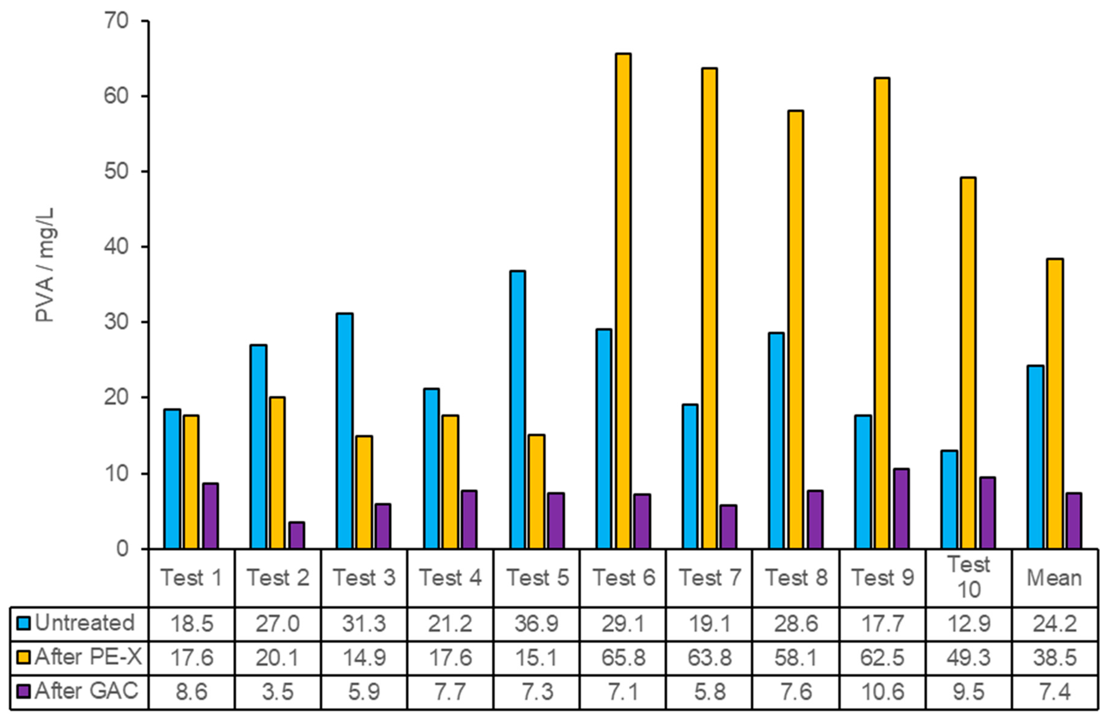 3.3. Removal of PVA and Microplastics at Pilot-Scale