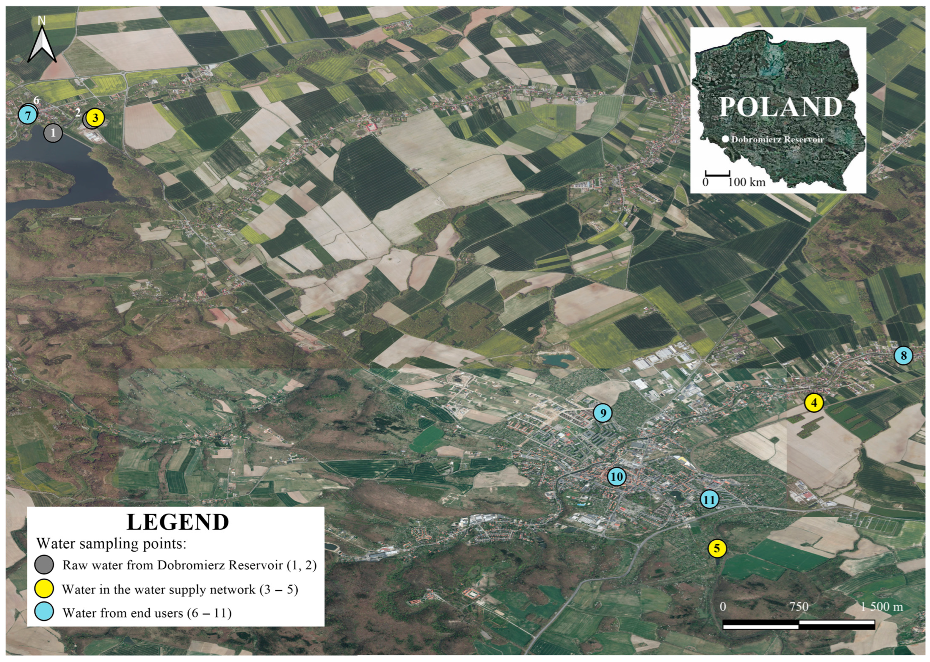 - SANEPID Wrocław. Results of Water Quality Analysis for the Dobromierz Reservoir and Water Quality in the Świebodzice Water Supply Network for Years 2009–2023; Wojewódzka Stacja Sanitarno-Epidemiologiczna: Wrocław, Poland, 2024. [Google Scholar]