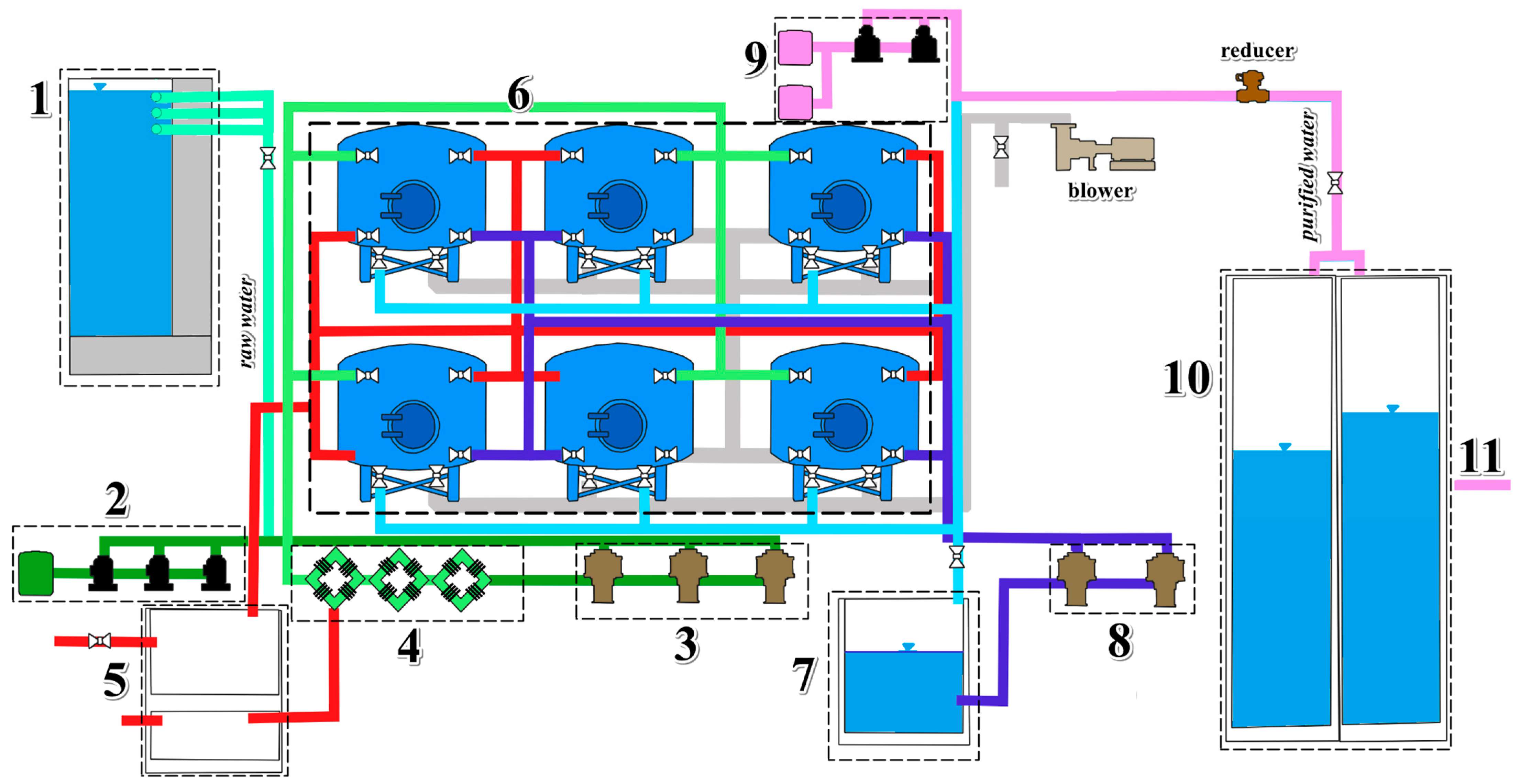 - Pre-filtration—pre-filtration is performed on ARKAL membrane filters, type Star Battery System 12 × 10. This system is activated sporadically, at very high turbidity values.