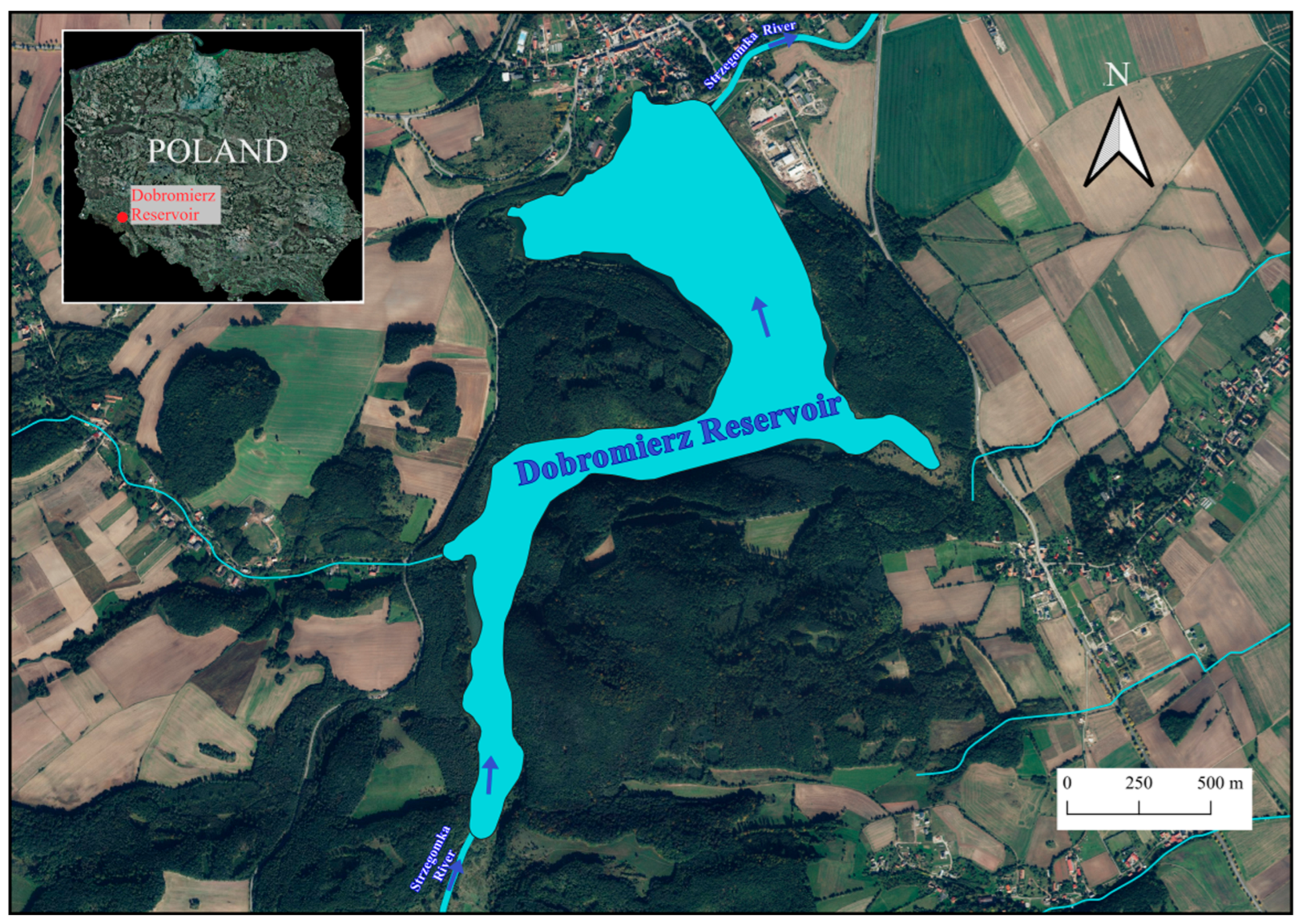 - WIOŚ Wrocław. Results of Water Quality Analysis for the Dobromierz Reservoir for years 2009-2023; Provincial Inspectorate of Environmental Protection: Wrocław, Poland, 2024. [Google Scholar]
