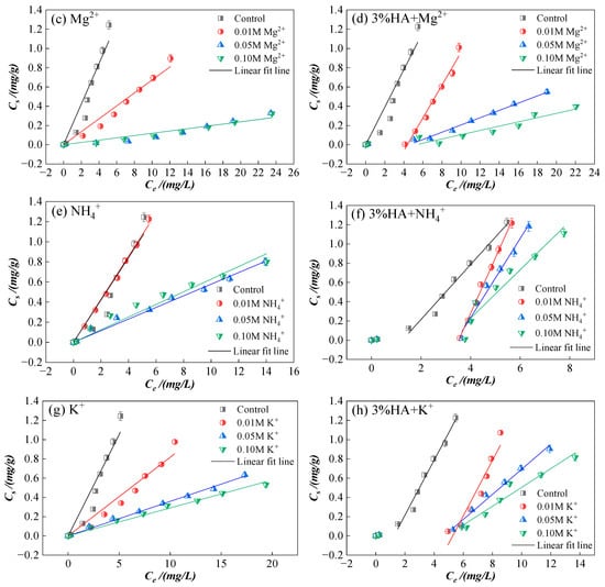 Sorption isotherms of CIP on sierozem under different ion strengths in the single system and after adding 3% HA. (a) Effect of the different strengths of Ca2+; (b) At the presence of HA under different strengths of Ca2+; (c) Effect of the different strengths of Mg2+; (d) At the presence of HA under different strengths of Mg2+; (e)Effect of the different strengths of NH4+; (f) At the presence of HA under different strengths of NH4+; (g) Effect of the different strengths of K+; (h) At the presence of HA under different strengths of K+.