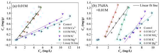 At low ionic strength (0.01 mol/L), NH4+ exhibits a stronger inhibitory effect compared to Ca2+. However, as the ionic strength increases (>0.05 mol/L), the relative effects of NH4+ and Ca2+ are reversed. This shift may be attributed to the fact that at low concentrations, both HA and NH4+ carry net charges—HA being predominantly negative and NH4+ positive—leading to charge neutralization on the soil particle surface. Functional groups in HA, such as -COOH and -OH, can also compete with NH4+ for sorption sites. Tomza-Marciniak et al. [44] similarly observed that HA competes with NH4+ via its functional groups, influencing NH4+ behavior in soil. As ionic strength rises, HA becomes saturated through interaction with excess NH4+, and a fraction of NH4+ begins to exert a slight promotive effect. In contrast, Ca2+, as noted earlier, becomes surrounded by counterions at high ionic strength, partially neutralizing sorption site charges and weakening electrostatic interactions between the adsorbent and adsorbate. Consequently, the inhibitory effect of Ca2+ exceeds that of NH4+ under these conditions.
