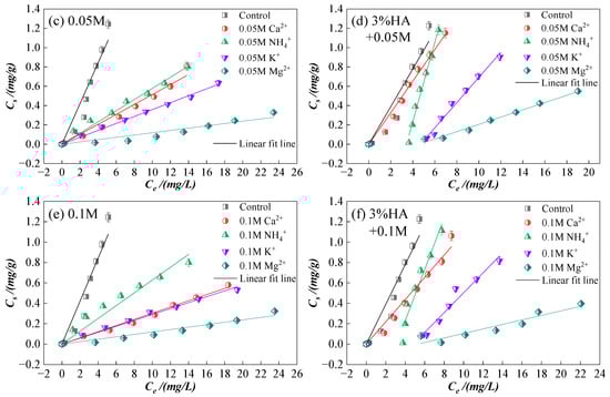 Sorption isotherms of CIP on sierozem under the different ions in the single system and after adding 3% HA. (a) Under 0.01 M with different ions; (b) At the presence of HA under different ions with 0.01 M; (c) Under 0.05 M with different ions; (d) At the presence of HA under different ions with 0.05 M; (e) Under 0.1 M with different ions; (f) At the presence of HA under different ions with 0.1 M.