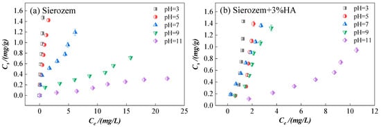 Changes in solution pH within the sorption system influence not only the surface charge and charge density of the soil but also significantly alter the speciation of CIP, thereby affecting its sorption behavior. As an ionizable compound, CIP exhibits different molecular forms under varying pH conditions (Table 1). This study examines changes in CIP sorption on sierozem at 25 °C across different pH levels, both with and without HA addition. As shown in Figure 5, the influence of pH on CIP sorption is consistent in both systems. When pH increased from 3 to 11, the sorption capacity of CIP on sierozem decreased markedly from 1.472 mg/g and 1.436 mg/g to 0.318 mg/g and 0.944 mg/g, respectively, indicating a clear trend of declining sorption with increasing pH.