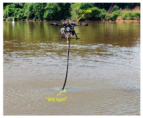 Water quality has traditionally been monitored by satellite and in situ sensors [2]. In situ measurements are accurate but labor and logistically intensive to maintain over extended periods of time at multiple locations because they can only measure one point at a time (e.g., Ref. [2]). Satellite sensors infer measured quantities, which reduces their accuracy and they are also estimated at a coarse resolution; thus, satellite measurements may offer no help for smaller inland bodies of water. In recent years, small uncrewed aircraft systems (sUAS, widely known as aerial drones) have emerged, particularly as a means to monitor water properties at scales that fill the gap between these two traditional methods. sUASs offer relatively broad spatial coverage at relatively fine resolution at low cost, but the accuracy of such measurements remains uncertain. sUAS-based water sampling would be particularly helpful for water bodies that are difficult to access, when fast mobilization of sampling is needed (e.g., before/after storms), and/or simply anytime labor is a limiting factor for water quality monitoring [3,4]. Since 1980, sUASs have been used to monitor or estimate chemical oxygen demand, total nitrogen, dissolved oxygen, total phosphorus, electrical conductivity, pH, chlorophyll, turbidity, temperature, total suspended solids, and CDOM (colored dissolved organic matter) [5,6]. Pillay et al. [6] show a steep increase in the number of studies using solely sUAS-based data, especially since 2020. Typically, sUAS-based water quality measurements rely on either hyperspectral/imaging methods that collect data using non-invasive (i.e., remote sensing/imaging) methods [6,7,8] or use pumps and water bottles to collect samples that are either processed on-board and discarded, or stored on-board for subsequent analysis [3,9,10]. For the former, water properties are inferred and require calibrations to ensure the inferred water properties are accurate. The latter approach stems from concern that the sUAS presence and operation may affect or “contaminate” the measurements, so water must be pumped up to the sUAS from well below the surface (typically > 1 m). By contamination, we simply mean that the water’s properties have been impacted in some way by the presence of the sUAS. The weight of the payload due to the pump, sampling sensor, and stored (or flow-through) water makes the requirements for the sUAS mission much more demanding [5,11]. Discrepancies, especially in chemical composition, have been observed between sUAS-based water quality measurements and in situ measurements [3,9], which begs the question of whether the discrepancies stem from sUAS-based contamination of the sampled water and/or inaccuracies of hyperspectral/imaging methods.