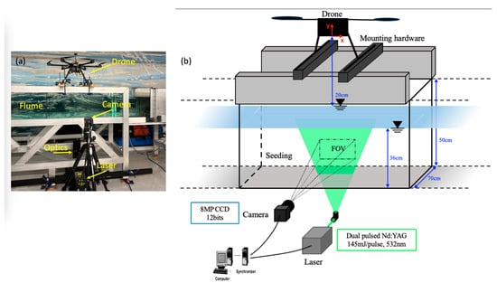 Experiments were conducted in a water flume with a cross section of 0.7 m (wide) × 0.5 m (deep) and a length of 16 m that was filled with fresh water to a depth of 36 cm. The water in the flume was stagnant at the start of each experiment. A customized Aurelia X6 hexacopter sUAS developed at the University of South Carolina [4] was utilized in the experiments. It consisted of six rotors (or “blades”) spanning approximately 147 cm, with each rotor having a length of 46.5 cm. The sUAS was secured across the top of the flume at 20 cm above the water line, shown in Figure 2, and its rotors turned on at various speeds. The air flow speed underneath the sUAS was estimated at the start of each experiment with a digital air flow meter by measuring the maximum air flow speed over an approximately 30 s period at the elevation of the sUAS’s feet. The sUAS was operated for 1–2 min before flow measurements were initiated. Measurements were performed using the particle image velocimetry (PIV) technique along the center of the water channel, imaging 2D flow velocities (u, v) in the along-channel (x) and vertical directions (y) (see Figure 2). The PIV setup, data acquisition, and processing are described in the subsequent subsections.