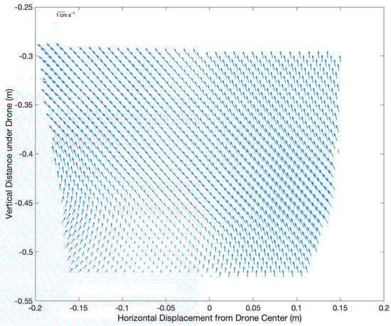 Ensemble-mean PIV velocity map for the 7.5 m s−1 target air flow speed under the sUAS center. Every 5th vector is displayed for clarity. See red scale vector.