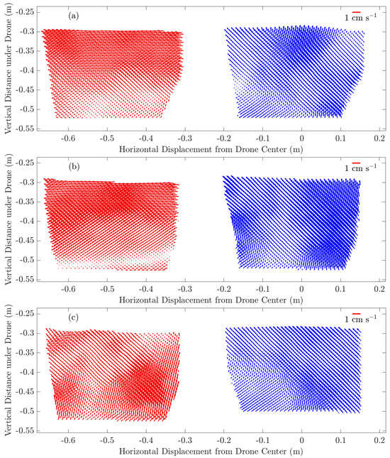 Ensemble-averaged flow velocities for the target air flow speeds of (a) 5 m s−1, (b) 7.5 m s−1, and (c) 10 m s−1. Flow under the rotor/blade is in red and flow under the body is in blue, and also, see the scale vector in the upper right corner of each subfigure. Every 5th vector is shown for clarity.