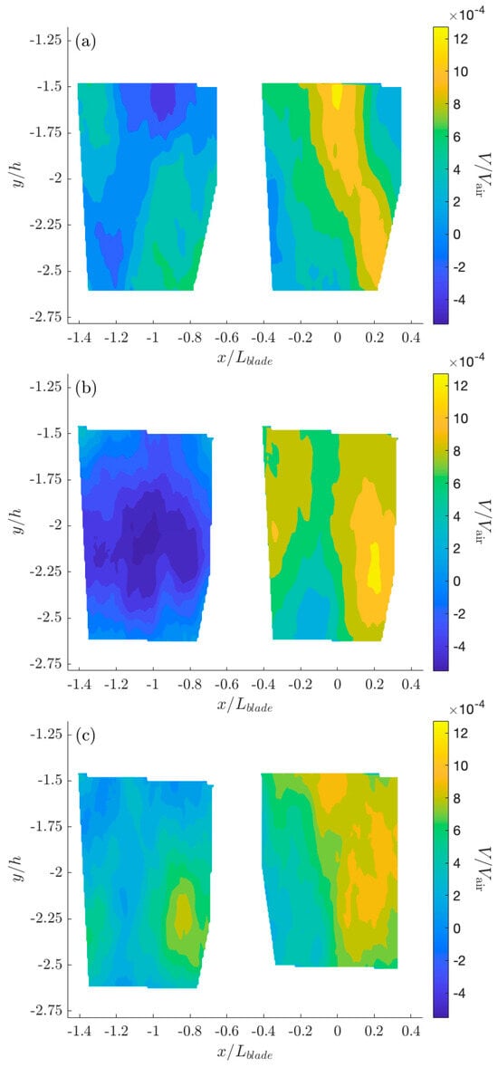 To better evaluate the presence of upwelling due to surface divergence of the flow, we show contour plots of the vertical velocities under the sUAS body and blade in Figure 5 that are normalized by the measured air flow speed (Vair), the hover height of the sUAS above the water (h = 20 cm), and the length of the blade (Lblade = 46.5 cm). In Figure 5, the region of upwelling below the sUAS is very apparent and widens as the air flow speed increases. For the 5 m s−1 and 7.5 m s−1 target air flow cases, under the blade, very small upward or downward velocities are observed; recall that the differences between the actual air flow speeds and the target speeds under the blade for the 5 m s−1 and 7.5 m s−1 target speeds were more similar to each other, relative to the differences for the measurements performed under the sUAS body at these target speeds (Table 1). This similarity in air flow speed may lead to more similar circulation under the blade relative to the 10 m s−1 target air flow speed case. Furthermore, it is important to recall that the under-body and under-blade measurements were not performed at the same time; thus, perfect continuity across the two FOVs is not expected.
