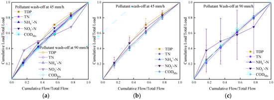 The first flush effect of non-point source pollution parameters under different rainfall intensities also varies. We found in this experiment that the first flush effect of pollutants under 45 mm/h is slightly higher than that under 90 mm/h. Among them, the cumulative curve for TDP at 45 mm/h exhibited the greatest deviation from the diagonal, indicating the most pronounced first flush effect. Under 45 and 90 mm/h, the several indicators with a relatively strong first flush effect for the five pollutants are - (90 mm/h) > TDP (45 mm/h) > - (45 mm/h) > CODMn (90 mm/h) > TN (45 mm/h). As the intensity of rainfall increases, the first flush effect of CODMn and - becomes significantly enhanced, while that of TDP and TN is the opposite. CODMn exhibited a distinct first flush effect under 90 mm/h, which is related to its existence form in road stormwater runoff (particulate-bound state) and the size of raindrops (the median diameters of raindrops at 45 and 90 mm/h were 0.98 and 2.28 mm, respectively, according to the calibration results of the simulated rainfall device [29]). Overall, given the same number of antecedent dry days, the more pronounced first flush effect under 45 mm/h is attributable to the steeper slope of the scoured slope subjected to this intensity, as presented in Table 1. This is in agreement with Lyu Zhidan et al. [40] regarding pollutants in Xuzhou road runoff, with the strength of the first flush effect across different rainfall intensities following the sequence of light rain > moderate rain > heavy rain.