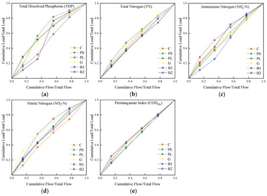 At home and abroad, scholars commonly use the M(V) curve [36] to describe the cumulative pollutant transport patterns and determine the occurrence of the first flush effect in the identification methods for the initial pollutant flush phenomenon. Thus, a dimensionless cumulative curve is constructed by plotting the ratio of the cumulative load proportion of each pollutant in the runoff effluent against the cumulative flow proportion. This curve illustrates the variation in the ratio between cumulative pollutant mass and total pollutant mass relative to the ratio between cumulative runoff volume and total runoff volume. When the slope of the M(V) curve is greater than 1 or when the M(V) curve is above the diagonal line and the maximum dispersion is greater than 20, it indicates that initial scouring has occurred.