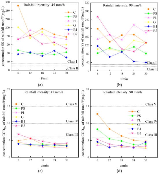 Bai Jianguo et al. [27], in their analysis of road runoff in Xuzhou City, identified this period as the critical timeframe for initial rainwater interception during which pollutant concentrations are highest and subsequently decline gradually. Similarly, Hu Wenli [28] confirmed that the first 30 min constitute the dominant phase for pollutant export in surface runoff. Given our focus on the concentrations of the most critical pollutants during this decisive interval, the initial 30 min period of rainfall was designated as the primary analysis period for surface runoff in this experiment. The “Integrated Wastewater Discharge Standard” (GB 8978-1996) [37] and the “Environmental Quality Standards for Surface Water” (GB 3838-2002) [38] were used as the reference standard limits for runoff pollution indicators. A characteristic analysis of pollutants (TN, SS, -N, TP and CODMn) in the initial rainfall under two rainfall intensities was conducted to determine the interception time.