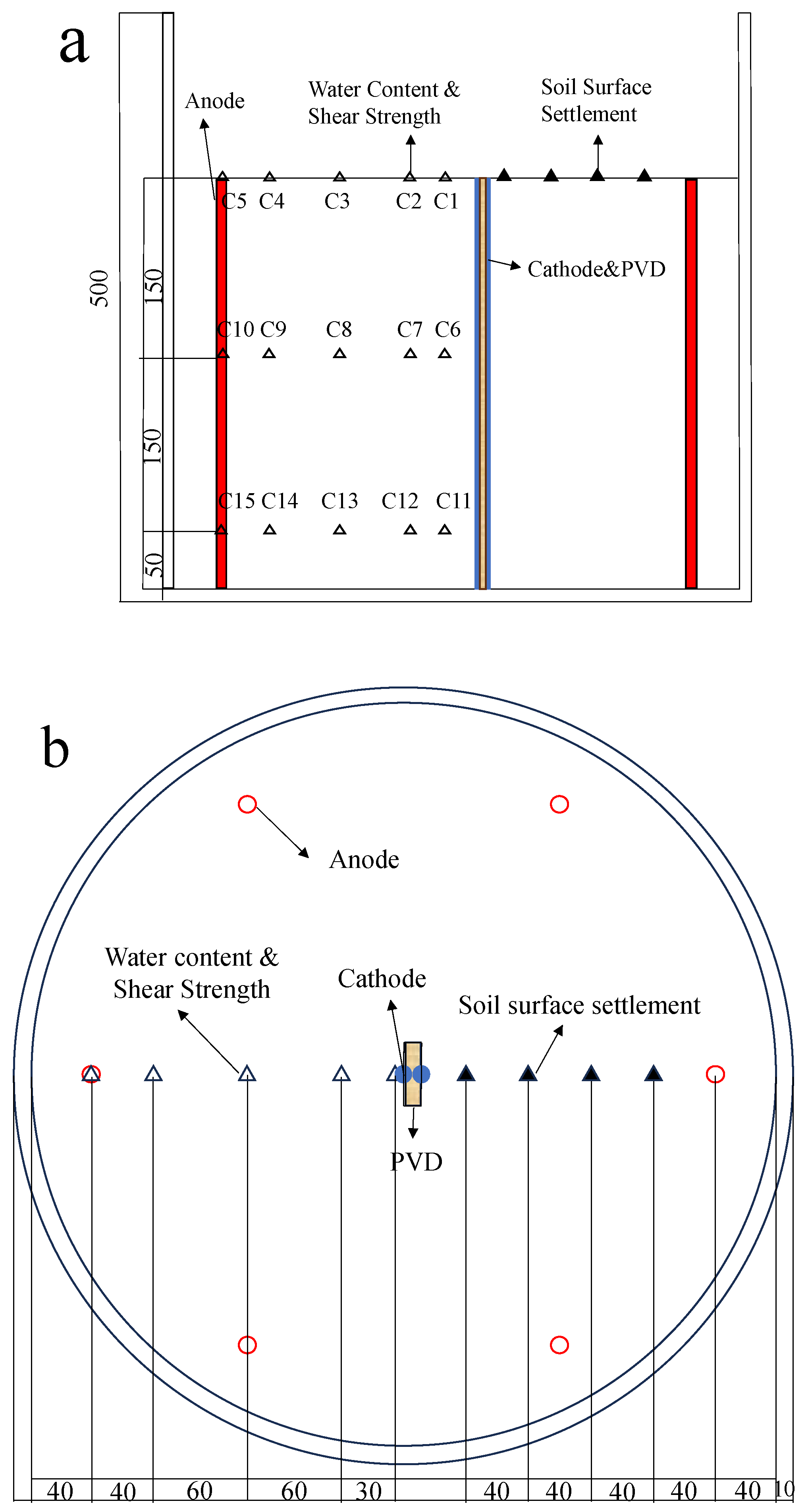 - Ren, Q.; Wang, Y. Theoretical and experimental study on the consolidation of soil with continuous drainage boundary under electroosmosis–surcharge preloading. Sci. Rep. 2024, 14, 31532. [Google Scholar] [CrossRef]