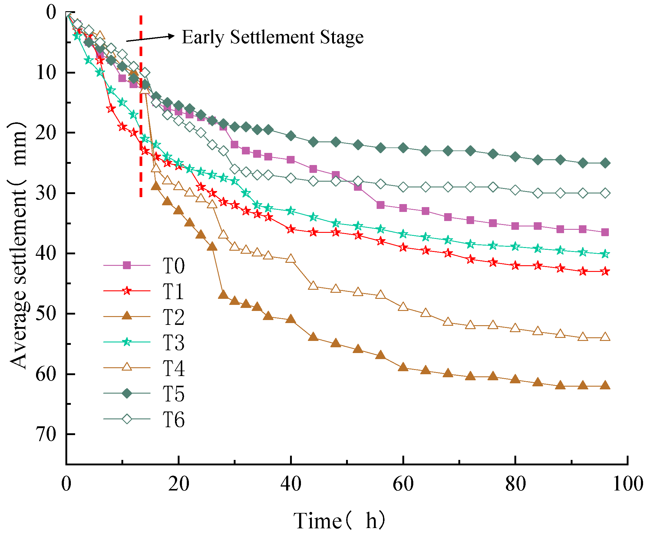 - While the synchronous reinforcement method improved initial settlement, its long-term efficiency is limited by the excessive coupled dewatering. This causes slower settlement progression and significant electrode corrosion, making it unsuitable for extended consolidation. In contrast, the alternating method exhibited moderate initial settlement but achieved stepwise improvement with late-stage electroosmosis integration. It resulted in 44.19% higher surface settlement and superior consolidation efficiency than the synchronous reinforcement method.