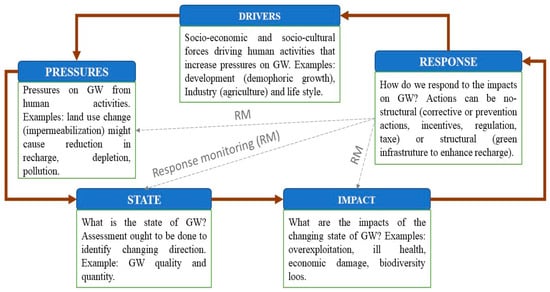 DPSIR can be applied to groundwater as follows: Drivers to GW consumption and pollution, Pressure on GW, State changes in GW, Impact upon GW quantity and quality, and Response to overcome threats and create conditions for sustainability.