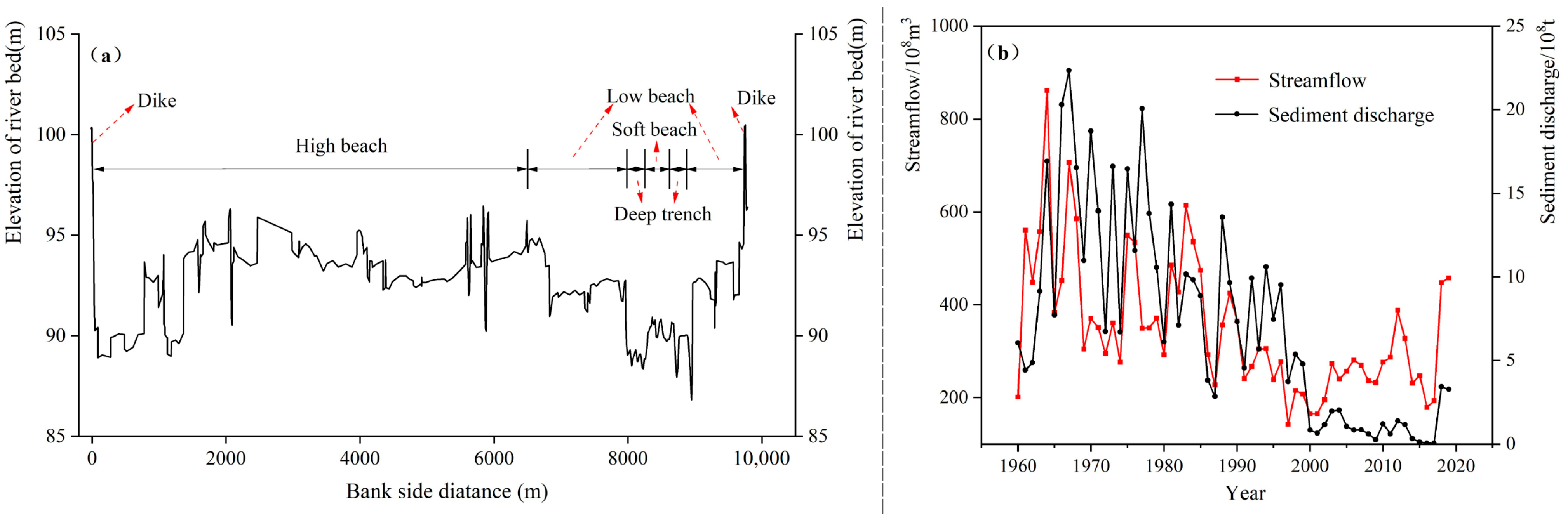 - Li, Y.; Zhang, J.L.; Huang, Z.; Bai, Y.; Song, X. Sediment deficit and morphological changes of alluvial floodplain in wandering reach of the Lower Yellow River after Xiaolangdi Reservoir operation. Environ. Earth Sci. 2023, 82, 535. [Google Scholar] [CrossRef]