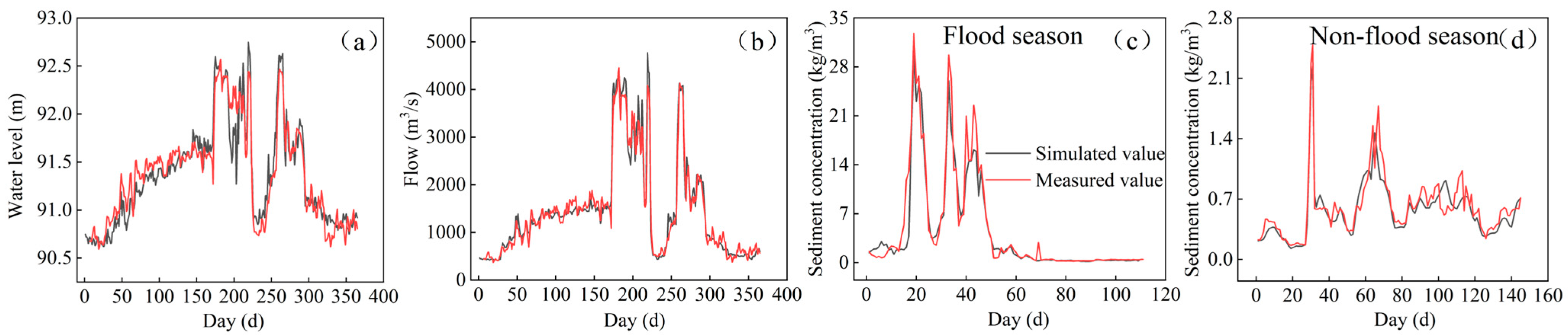 - Chen, C.X.; Zhu, C.H.; Zhao, X.; Gao, X.; Luo, Q.S. Scouring and silting law of the Lower Yellow River and water and sediment regulation indicators after the regulation of Xiaolangdi Reservoir. Adv. Water Sci. 2024, 35, 606–616. [Google Scholar] [CrossRef]
