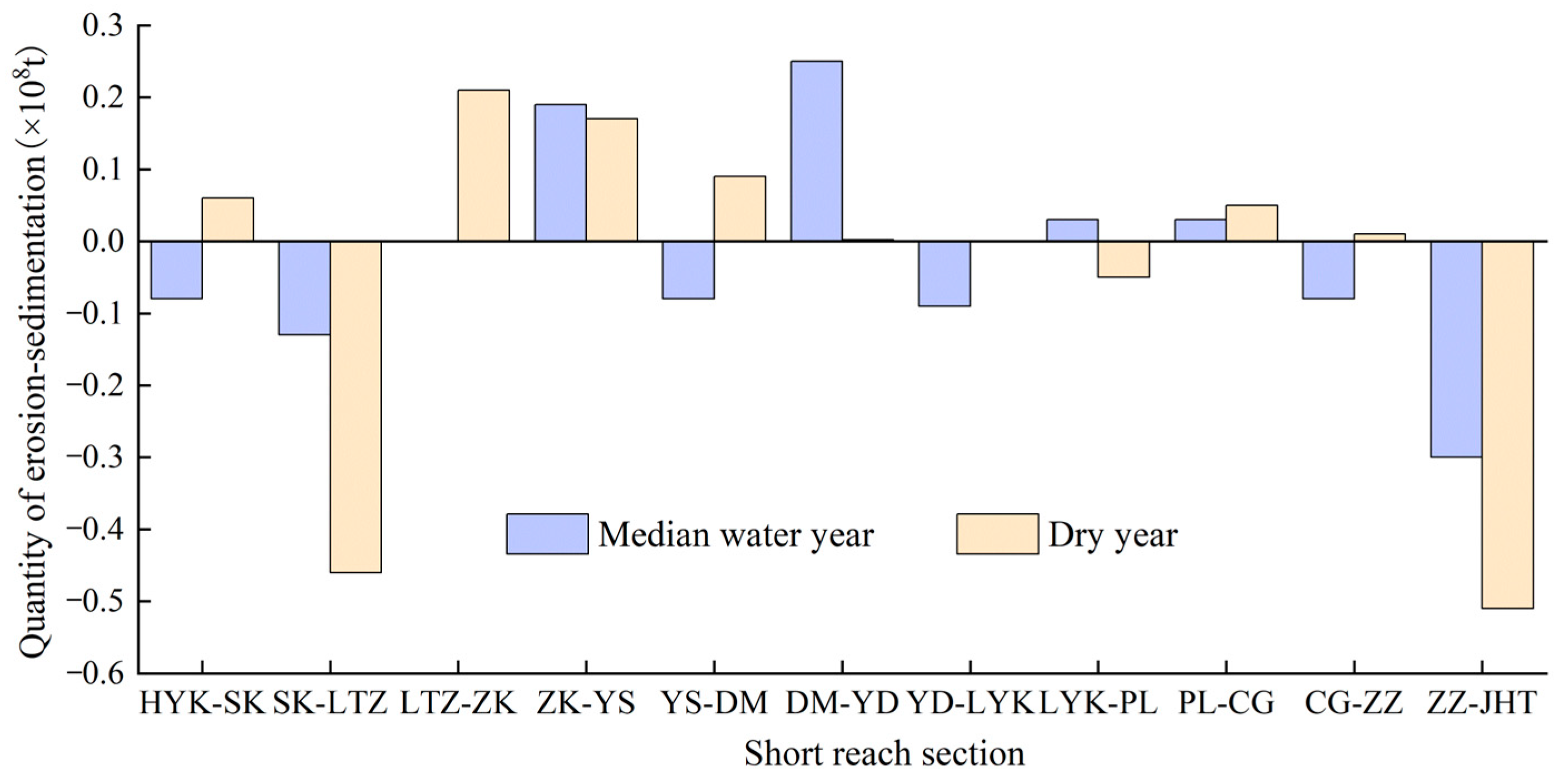 - After the XLDR operation, the HYK–JHT reach experienced erosion in the median water and dry years. The erosion volume in the dry year was greater than that in the median water year. The length of erosion decreased from 51.91% in the median water year to 34.61% in the dry year, whereas the length of sedimentation increased from 38.44% in the median water year to 65.36% in the dry year. The erosion volume was large and concentrated in the dry year, whereas it was smaller but more dispersed in the median water year.