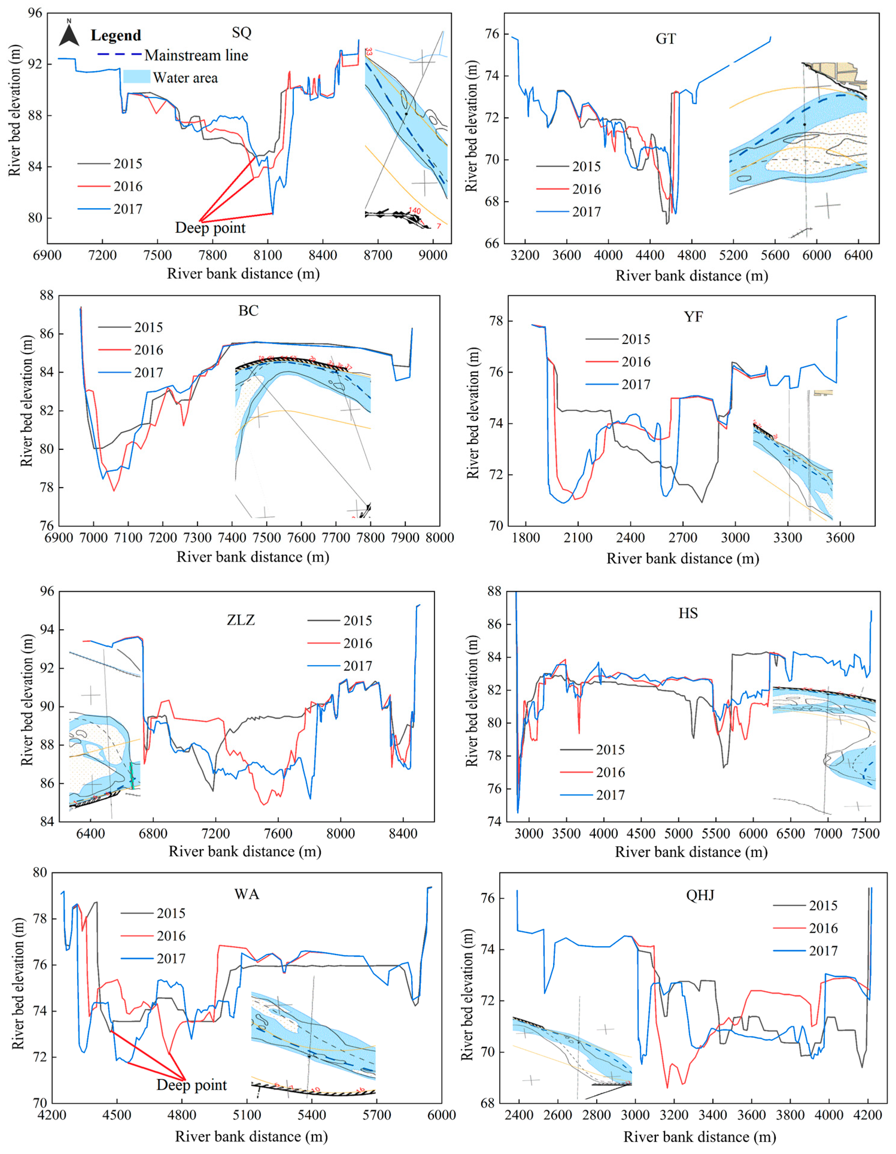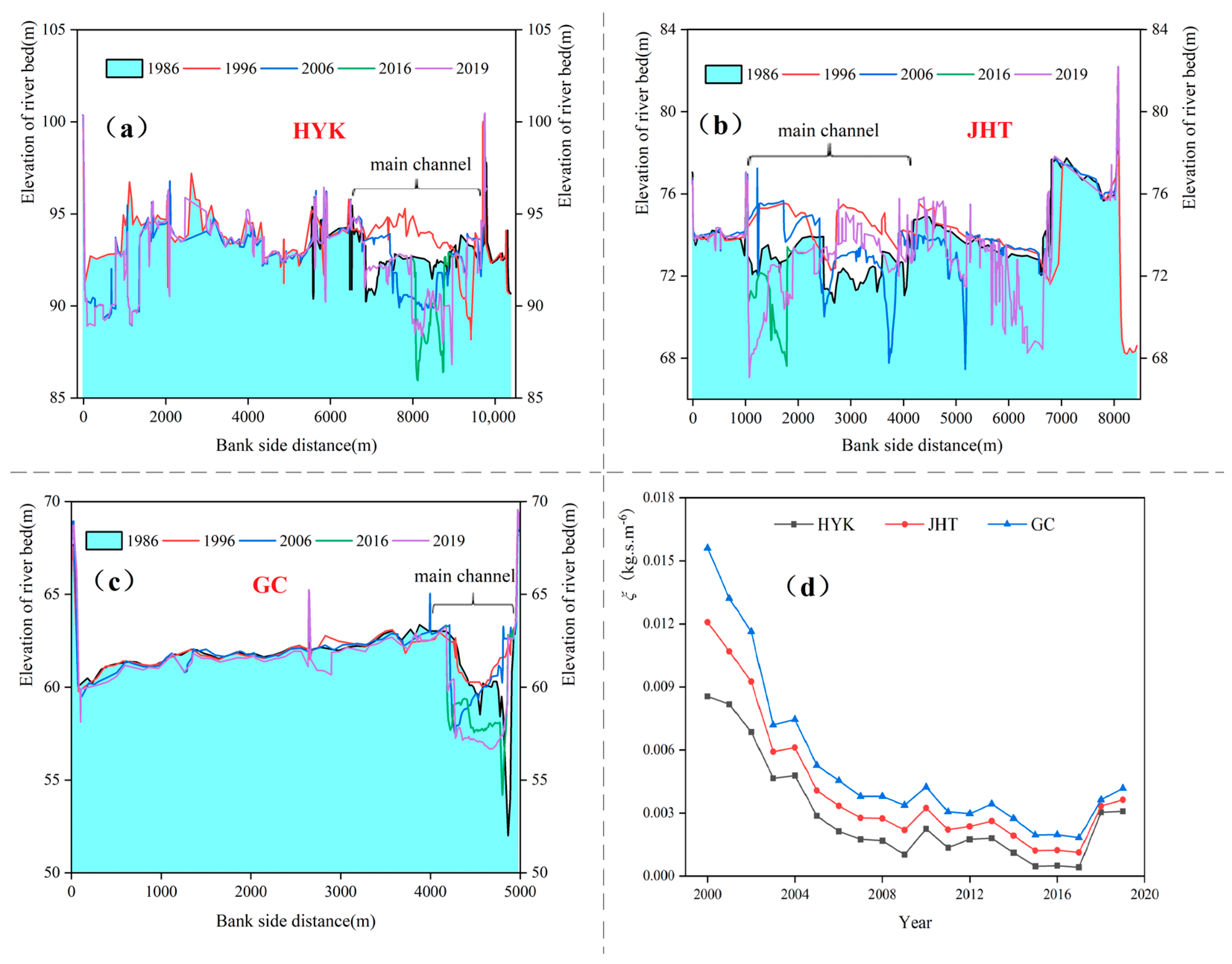 - The river channel cross-sectional shape evolution is influenced by changes in water-sediment conditions and also constrained by the main river flow direction and regulating engineering. In the area without the constraint of regulating engineering, the main channel of the river undergoes longitudinal and transverse erosion in the direction of the main river flow, such as cross-sections like SQ, GT, and QHJ. In the area with the constraint of regulating engineering, the main channel of the river undergoes longitudinal erosion within the area constrained by regulating engineering, such as cross-sections like BC, HS, and ZLZ.