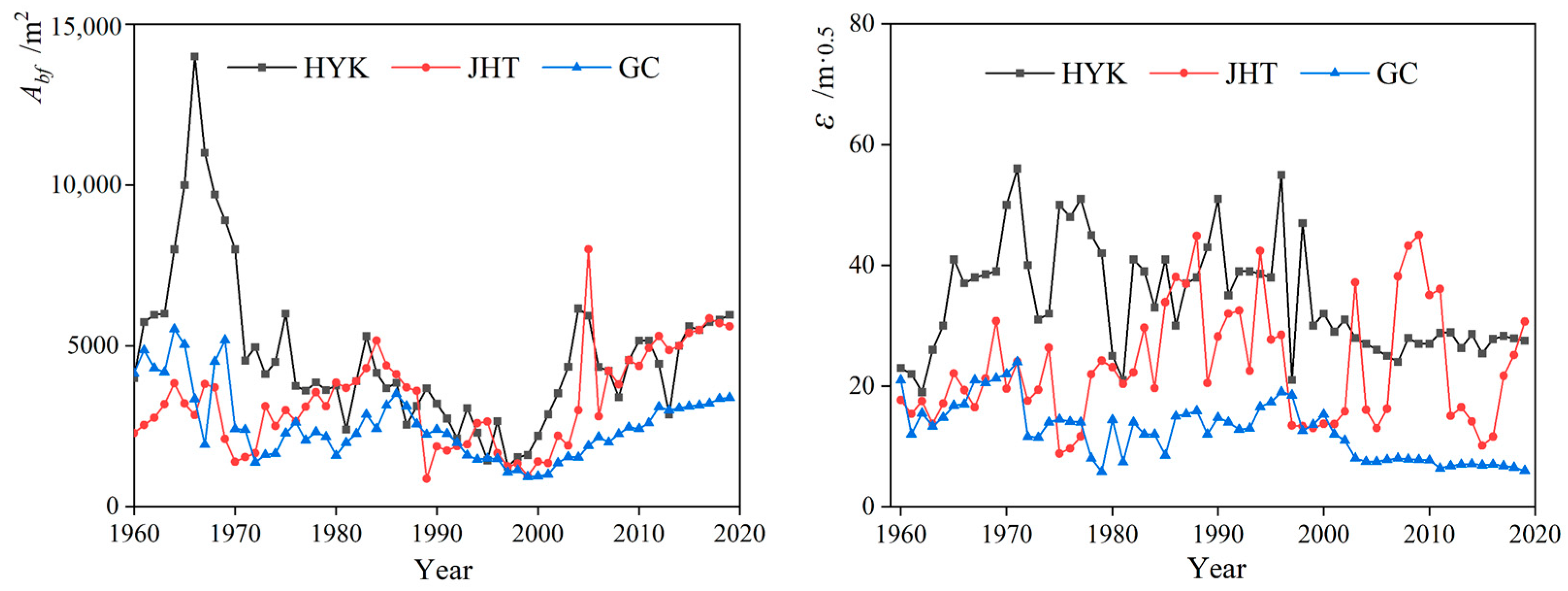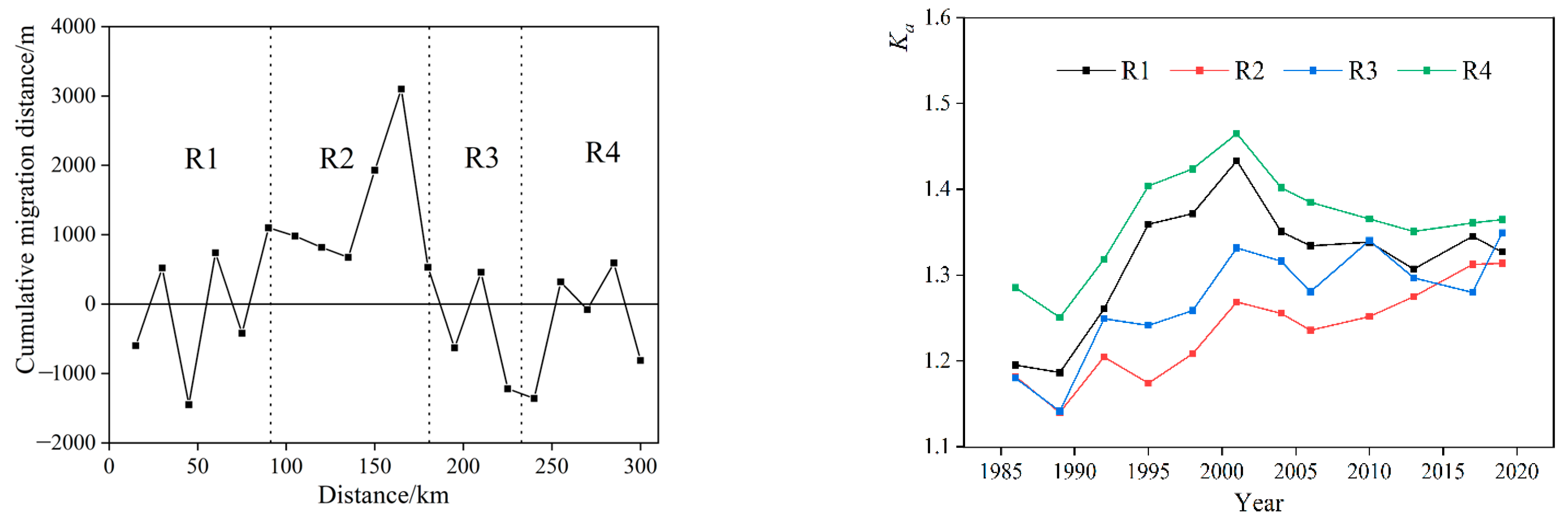 - By comprehensively selecting the parameters of river channel morphology, such as the bankfull area (Abf) and the fluvial facies coefficient (ε), as well as the evolution parameters of the main channel, such as the migration distance and the bending coefficient (Ka), the evolution characteristics of the main-channel morphology in the wandering reach over a long time series were analyzed.
