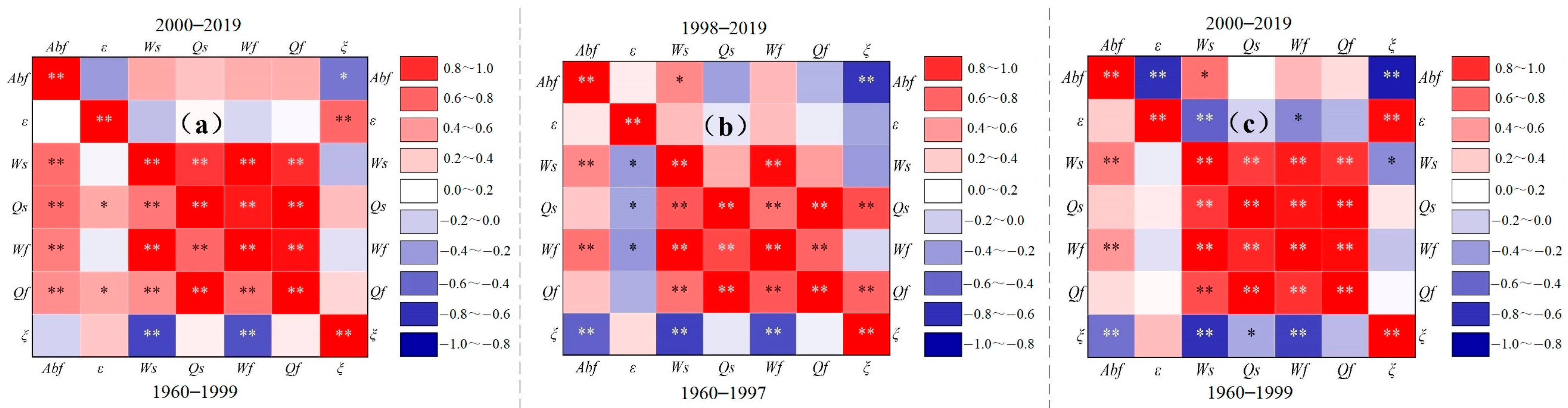 - Using the correlation analysis method, the relationships between the river morphology parameters and annual runoff volume, annual sediment discharge, flood season runoff volume, flood season sediment discharge, and sediment contribution coefficient were analyzed. Through multiple linear regression analysis, significant factors were further identified.