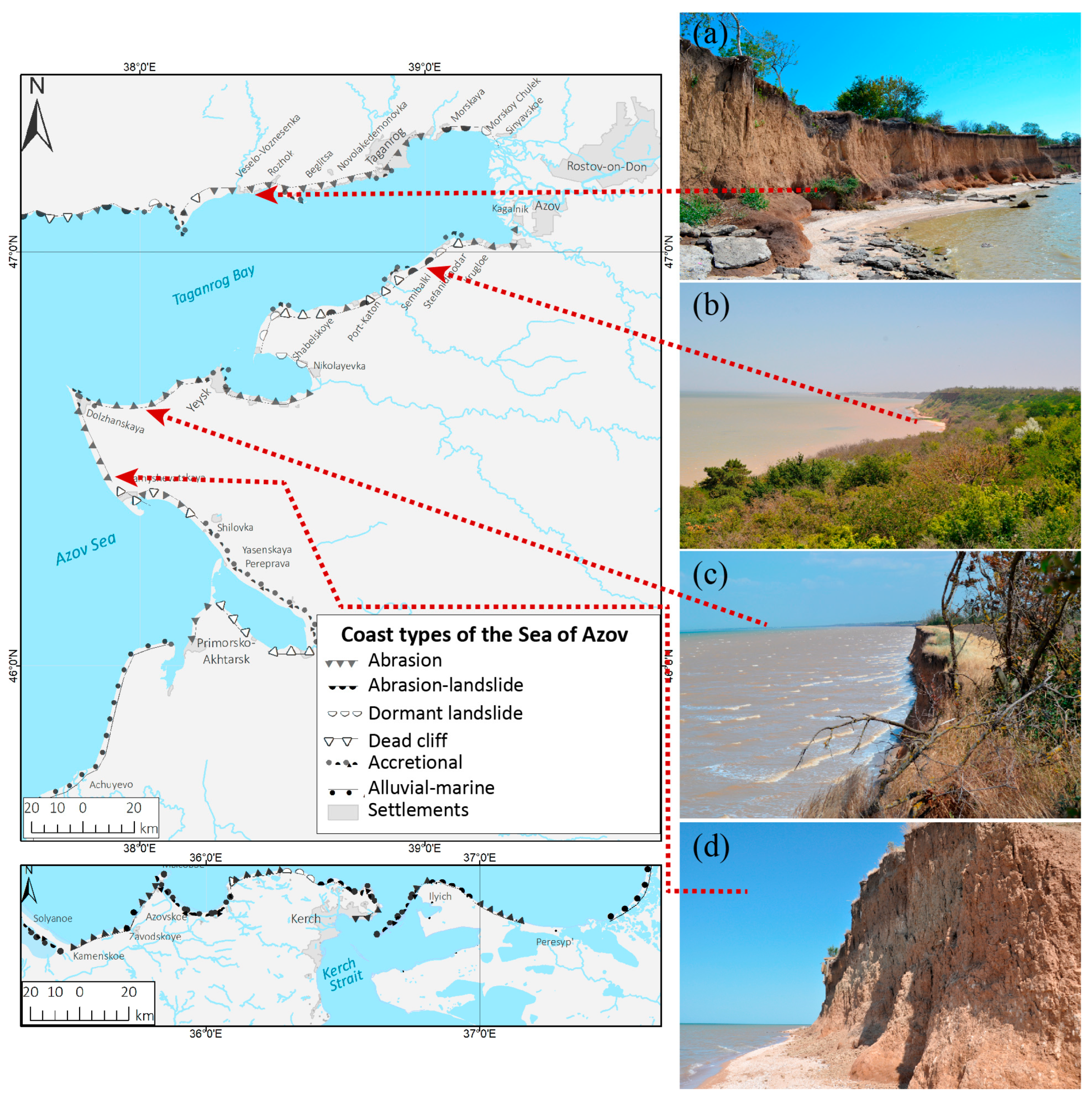 The scope of this analysis was deliberately focused on abrasional coastline types. Consequently, other significant coastal categories were excluded, specifically accretionary coasts, such as the sector from Primorsko-Akhtarsk to Temryuk, Arabat Spit, and accretionary segments of the Kerch Peninsula, as well as landslide-type coasts, which are widespread from Temryuk to Ilyich and throughout the northern Sea of Azov coast and Kerch Peninsula. This exclusion was necessary because the cliff-edge tracking methodology requires a clearly definable scarp, which is absent or ambiguous in landslide complexes, and precise water level data for accurate positioning, which was unavailable for the specific dates of image acquisition.