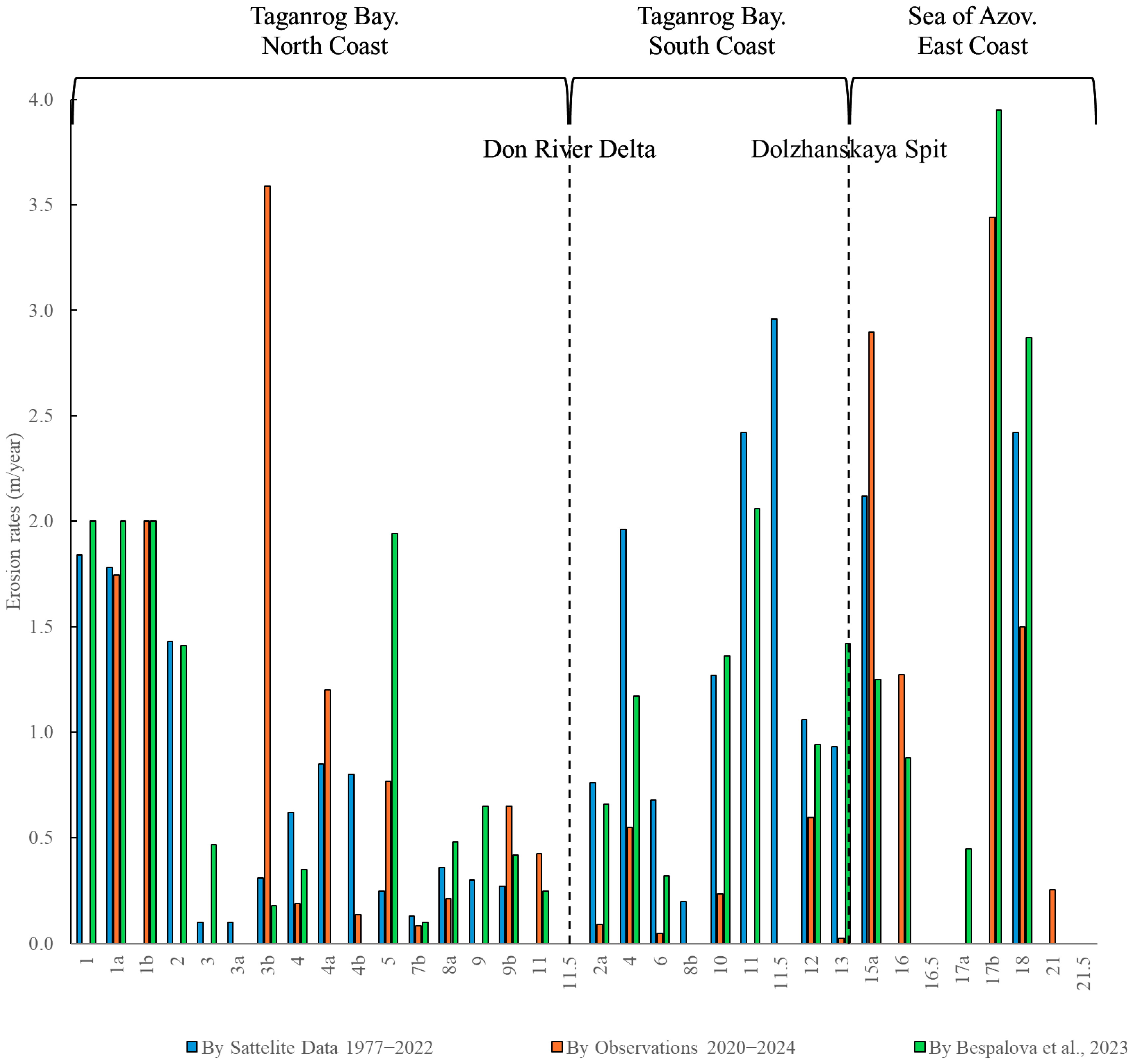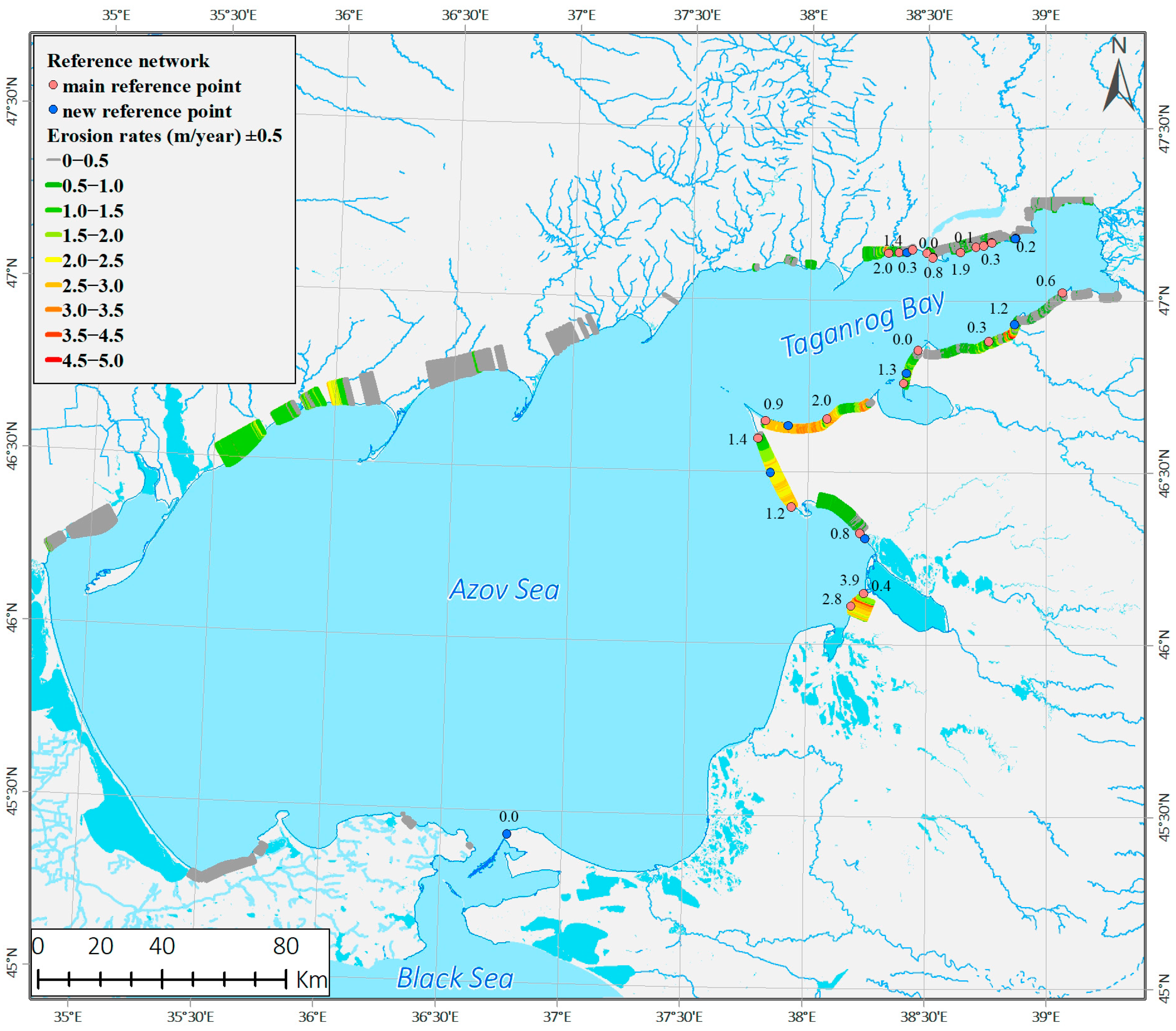 For the Sea of Azov, the continuity of these data is ensured by a long-term systematic monitoring program of cliff-edge retreat. Initiated in the mid-20th century by Rostov State University (now part of Southern Federal University) through an established reference network, this monitoring effort has been consistently sustained. Since 2002, the program has been further strengthened by collaborative efforts with researchers from the Southern Scientific Center of the Russian Academy of Sciences, operating within this same established network (