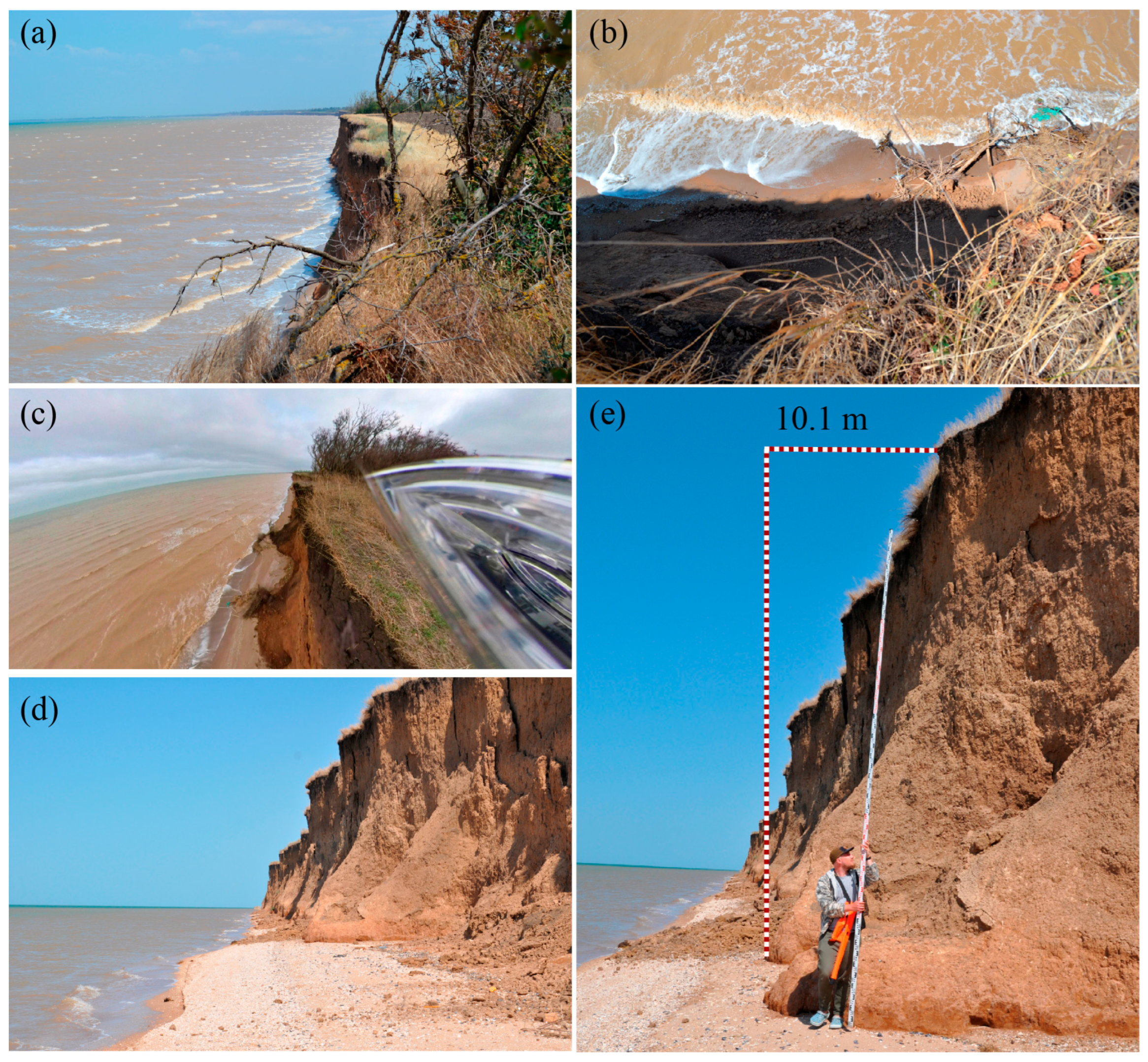 5]. The extreme erosion dynamics observed along its perimeter result from a synergistic interaction between its unique basin hydrodynamics and the geological fragility of the coast. Specifically, the sea’s limited depth and confined configuration efficiently focus wave energy, subjecting the shoreline to high-intensity stress. Crucially, the coast itself is composed of a succession of weakly consolidated and highly erodible sedimentary deposits, including loess-like loams, Scythian clays, and alluvial sands. These friable materials exhibit low geotechnical resistance and naturally form unstable, near-vertical slopes (