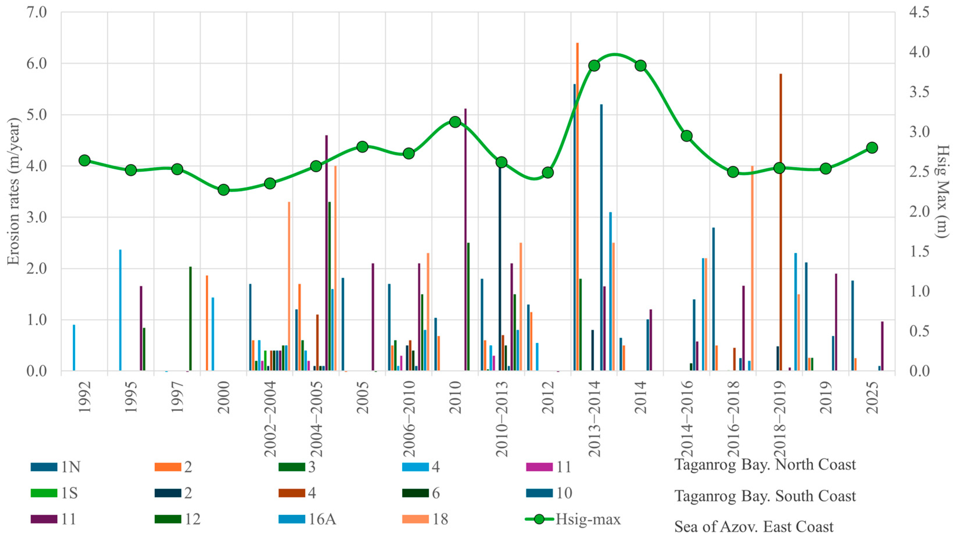 6], the most intense Sea of Azov storms are basin-wide phenomena, capable of generating wave heights of 3.5–4.0 m and surge-induced water level elevations of up to 2 m, which explains the peak in erosion observed during this time. A more detailed analysis of the hydrometeorological forcing mechanisms behind these abrasional events, particularly the role of winter conditions, is a critical objective for subsequent research.