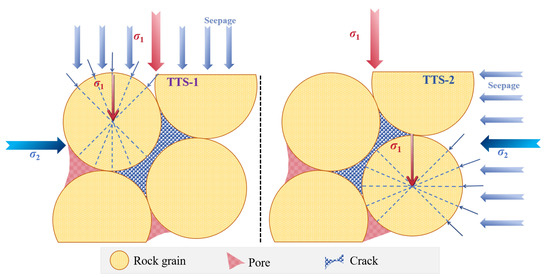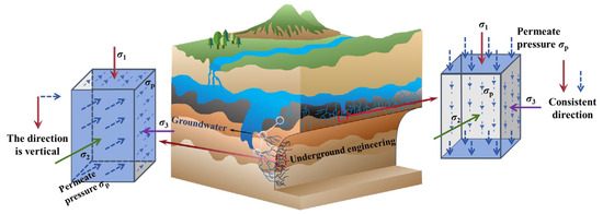 Deep resource exploitation and deep underground space utilization have become the norm, and deep engineering development will be an important field for humans in the future. However, the typical high-geostress and high-water pressure environment of deep rock masses may induce engineering disasters [1,2,3,4], and the combined effect of in situ stress and seepage pressure is very likely to cause the evolution of the original fractures within the rock [5,6,7]. Among them, different seepage directions can lead to significant differences in rock mechanical behavior, which greatly increases the complexity of underground engineering stability analysis [8,9,10,11,12,13]. The internal factors influencing rock deformation and failure are the propagation and connection of cracks. Characteristic stress, as an important basis for the division of crack evolution stages, is of great significance for research [14,15]. In addition, the intermediate principal stress has a crucial influence on the above process and is a factor that cannot be ignored [16,17]. Therefore, studying the evolution of characteristic stresses in rock under seepage conditions in different principal stress directions is of great importance for ensuring the stability of deep engineering under such complex seepage conditions. The seepage conditions in different principal stress directions are presented in Figure 1.