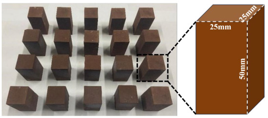 Mudstone, as a typical sedimentary rock in the shallow layer of the Earth’s crust, exhibits characteristics such as softening, disintegration, and even slurry formation when exposed to water [39]. It is widely observed in underground engineering projects. In this study, mudstone was selected as the research subject. Considering the inherent discreteness of rocks, specimens were collected from the same parent rock and then processed using an automatic rock-cutting machine and a grinding machine. To preserve the integrity of the specimens, water-cooled lubrication was maintained throughout the processing with low-speed and stable cutting and grinding operations. The final dimensions of the processed specimens were 25 mm × 25 mm × 50 mm. The processed rock specimens are presented in Figure 2. Following processing, unqualified specimens with obvious surface defects or substantial disparities in appearance were eliminated. Afterwards, rock specimens with similar wave velocities were selected through wave velocity monitoring to further reduce the discreteness. The average wave velocity of the final selected specimens is 2.451 km/s.