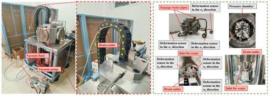 (1) The deformation sensors were installed. When conducting the seepage test along the σ1 direction, the seepage pipes were installed along the seepage channel in the σ1 direction (when conducting the seepage test along the σ2 direction, the seepage pipes were installed along the seepage channel in the σ2 direction). Then, the pressure chamber was closed.