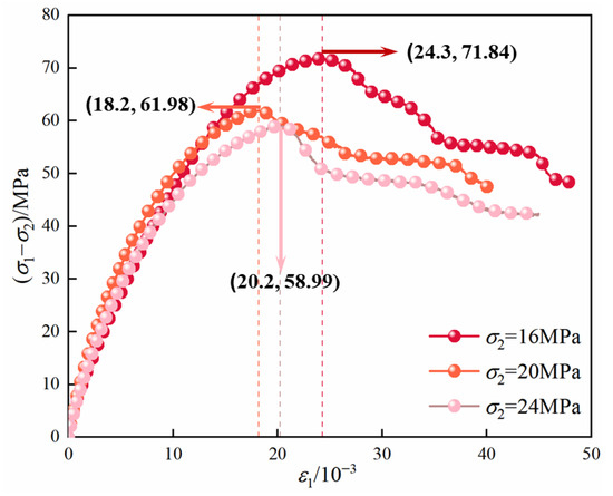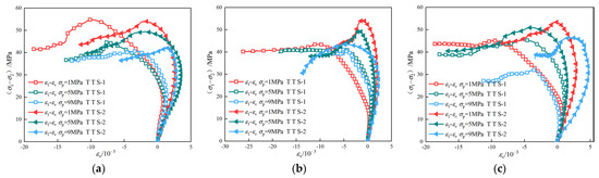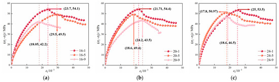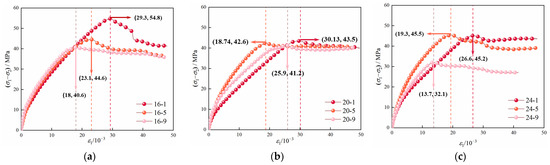 Stress–strain curves of mudstone under TTS-2: (a) σ2 = 16 MPa; (b) σ2 = 20 MPa; (c) σ2 = 24 MPa.