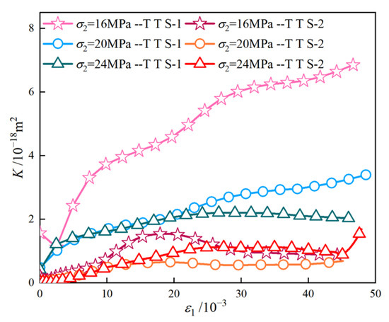 The stress–strain curves of mudstone under different seepage directions and non-seepage conditions are shown in Figure 6, Figure 7 and Figure 8. In these figures, 16-1 indicates that σ2 is 16 MPa, σp is 1 MPa, and the meanings of the other legends are similar. It is evident from Figure 7 and Figure 8 that, under the same σ2, the peak stress σf of mudstone decreases as σp increases. Taking the case of σp = 1 MPa as an example, the relationship between the permeability and strain of mudstone under seepage conditions in different principal stress directions is analyzed, as shown in Figure 9. As can be observed from the figure, after TTS-1 shifts to TTS-2, permeability significantly decreases. The analysis suggests that, as the maximum principal stress generates fractures with a smaller angle to its direction during loading [44,45], under the seepage condition in the direction of the intermediate principal stress, the permeability may decrease due to the obstruction of water flow by the fractures. Specifically, when σ2 is 16 MPa, permeability decreases by 5.85 × 10−18 m2; when σ2 is 20 MPa, permeability decreases by 2.71 × 10−18 m2; and when σ2 is 24 MPa, permeability decreases by 0.93 × 10−18 m2. Under the TTS-2 condition, permeability decreases as σ2 increases.
