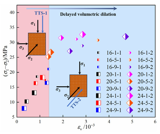 Figure 11 shows the volumetric dilation points of mudstone under different seepage directions. In this figure, 16-1-1 indicates that σ2 is 16 MPa, σp is 1 MPa, the seepage direction is as in the TTS-1 condition, and the meanings of the other legends are similar. The dividing line in Figure 11 separates the volumetric dilation points under seepage conditions in the σ1 and σ2 directions. It is located between the maximum value of volumetric strain under seepage in the σ1 direction and the minimum value under seepage in the σ2 direction, indicating that all volumetric dilation points under the σ2 direction seepage condition are greater than those under the σ1 direction condition. This observation suggests a hysteresis effect in volumetric dilation. After TTS-1 shifts to TTS-2, the volumetric dilation of mudstone is notably delayed. To quantify the change in volumetric strain, its relative change was computed as the difference between εv under TTS-2 and εv under TTS-1, divided by εv under TTS-1. Considering the conditions of σ2 being 16 MPa and σp being 9 MPa as an example, under TTS-1 conditions, εv = 0.138%, and under TTS-2 conditions, εv = 0.284%. Therefore, the value of volume dilation hysteresis under these conditions is (0.284% − 0.138%)/0.138% = 106%.