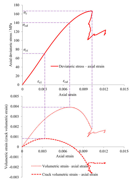 Many researchers have conducted research on the determination methods for crack initiation stress σci and crack damage stress σcd; for example, the fracture volume strain method for determining crack initiation stress σci and crack damage stress σcd and the acoustic emission method for determining crack initiation stress σci and crack damage stress σcd were studied in [46,47,48]. The schematic diagrams of these stresses and strains are shown in Figure 13.