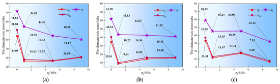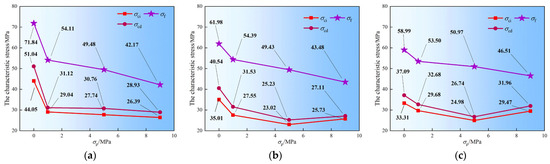 Characteristic stresses of mudstone under TTS-2: (a) σ2 = 16 MPa; (b) σ2 = 20 MPa; (c) σ2 = 24 MPa.