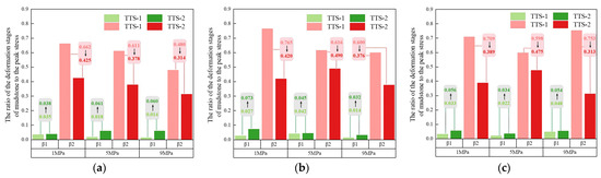 β1 is defined as the ratio of (σcd − σci) to σf, and β2 is defined as the ratio of (σf − σcd) to σf. In this formula, σf denotes is the corresponding peak stress under different σp. Figure 16 presents the ratio of the deformation process of mudstone to the peak stress under seepage conditions in different principal stress directions. Under constant σ2 conditions, β1 increases after TTS-1 shifts to TTS-2, while β2 decreases. Consequently, after TTS-1 shifts to TTS-2, the stable crack propagation stage of mudstone is prolonged, while the unstable crack propagation stage is shortened.